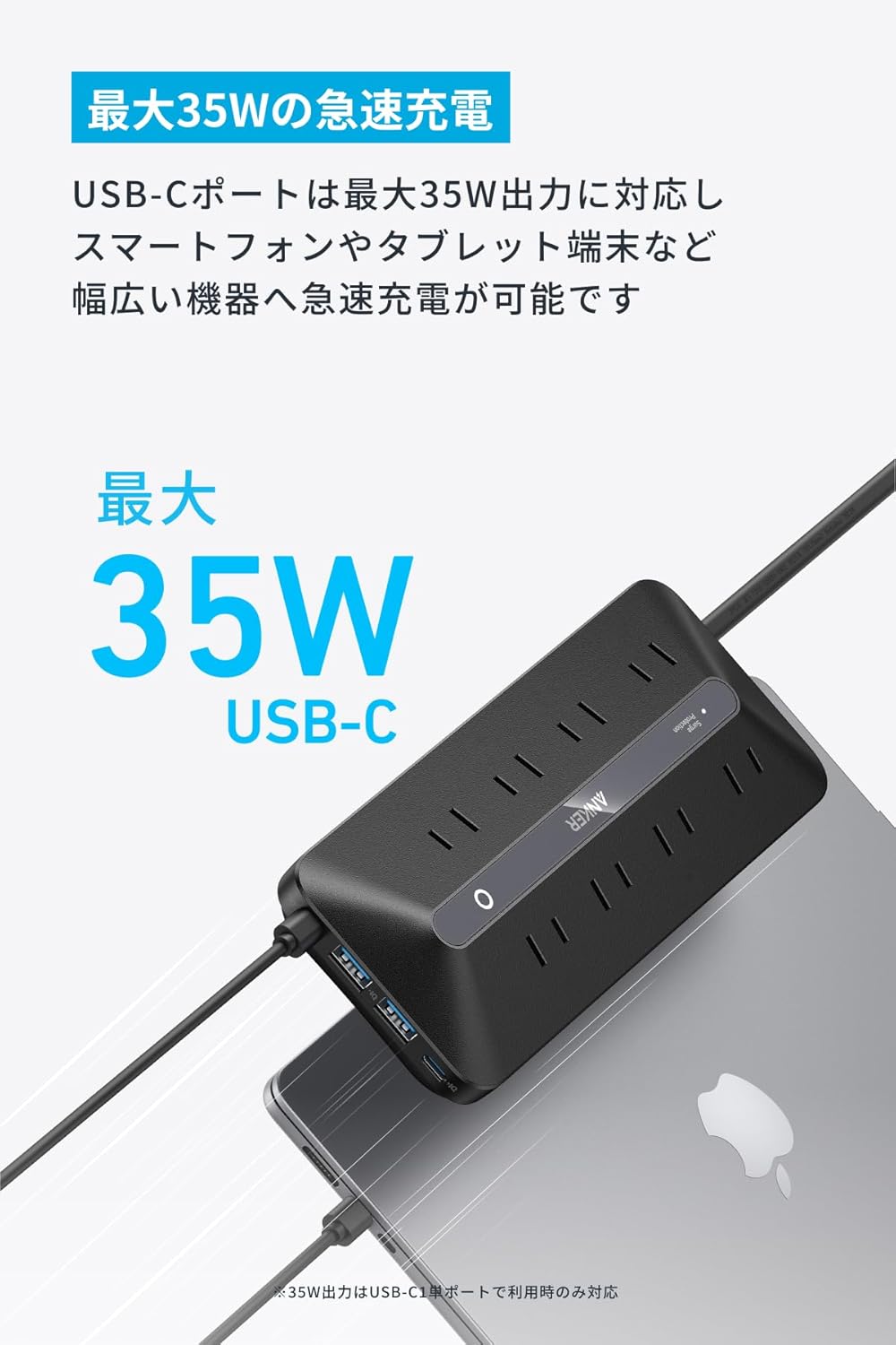 USB-Cポートは最大35W出力に対応し、スマートフォンやタブレット端末など幅広い機器へ急速充電が可能です (35W出力はUSB-C1単ポートで利用時のみ対応)。