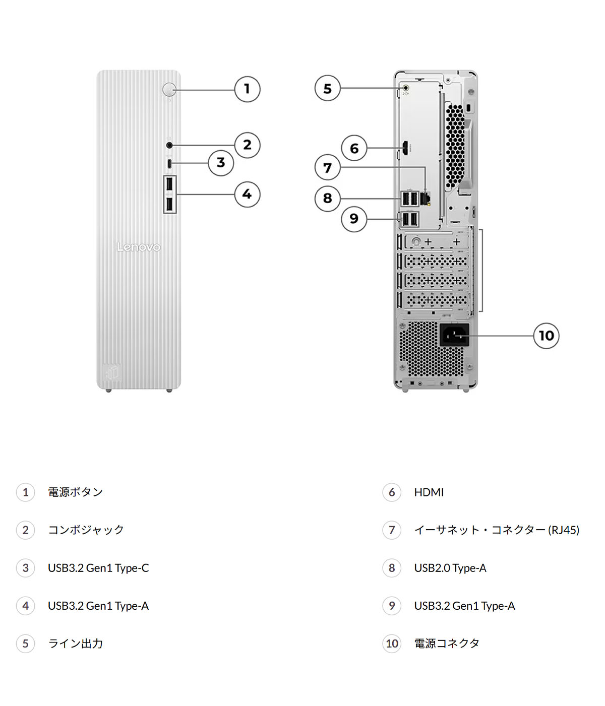USBポート: 前面:USB3.2 Gen1 Type-A×2、USB3.2 Gen1 Type-C×1、背面:USB3.2 Gen1 Type-A×2、USB2.0 Type-A×2;DisplayPort×1、HDMI 2.1×1;オーディオ関連ポート:前面:マイク入力×1、コンボジャック×1、背面:ライン出力×1;イーサネット・コネクター(RJ-45)×1
