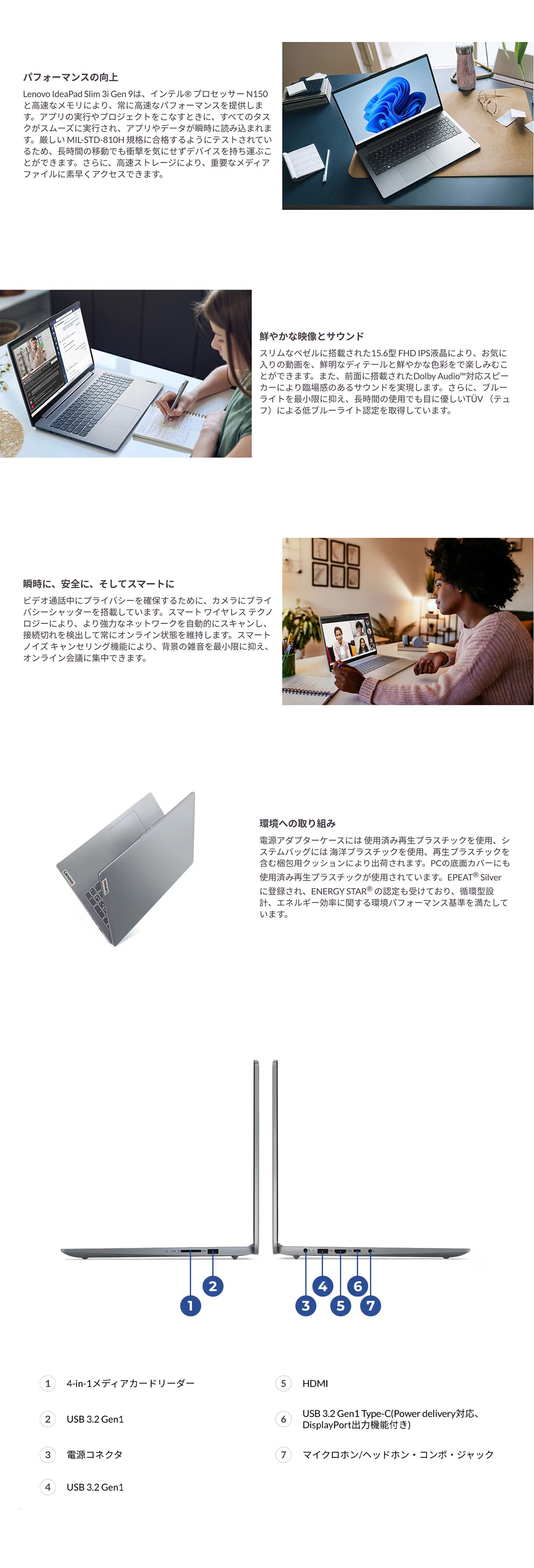 USBポート:Type-C:USB 3.2 Gen1×1(Powerdelivery対応、DisplayPort出力機能付き)、Type-A:USB 3.2 Gen1、HDMI、マイクロホン/ヘッドホン・コンボ・ジャック、イーサネット・コネクター(RJ-45)