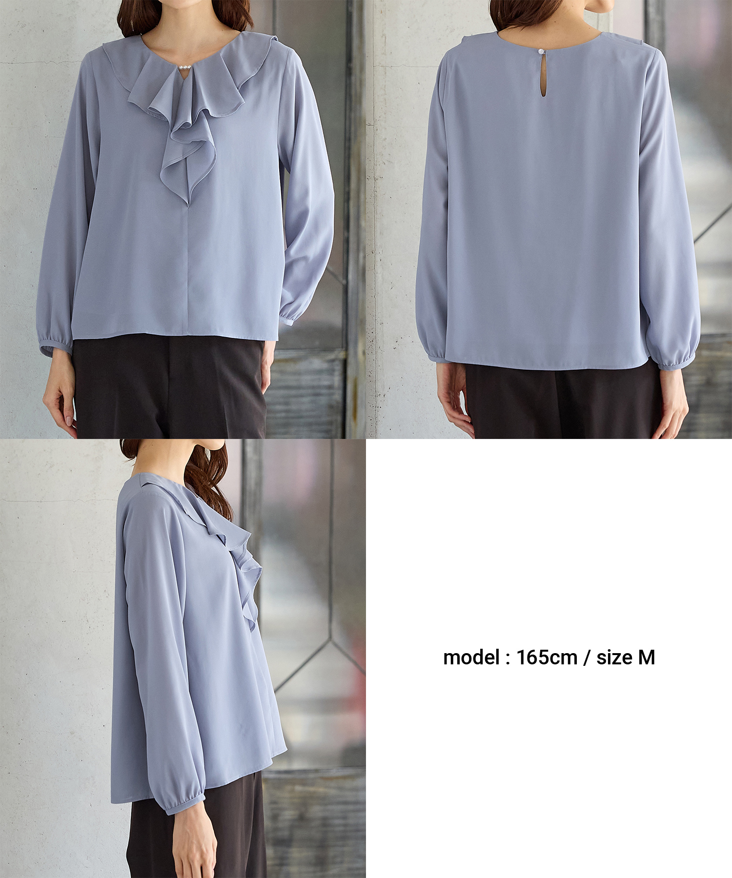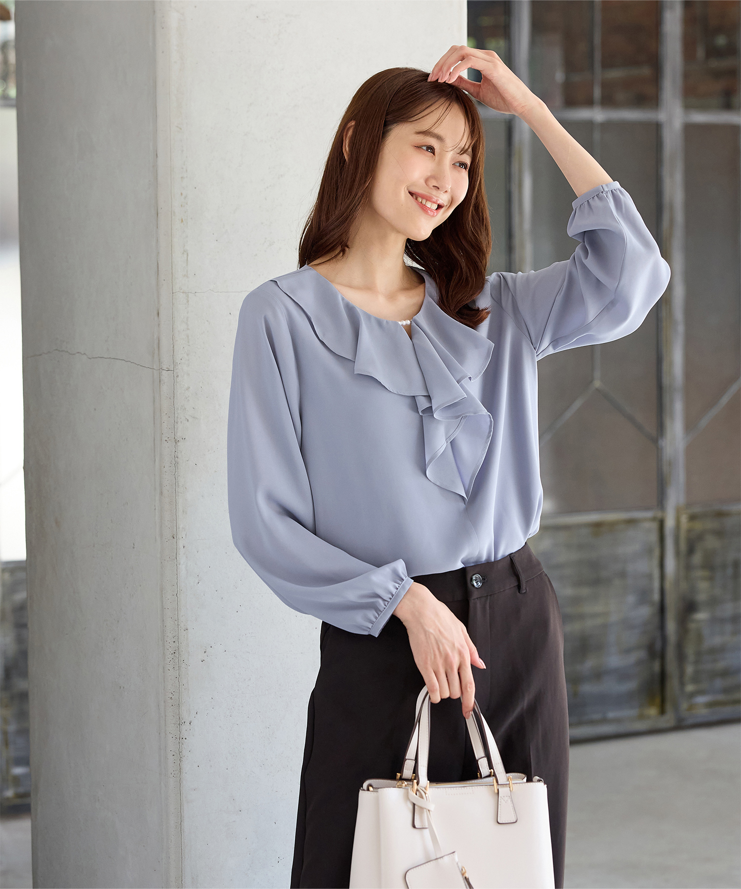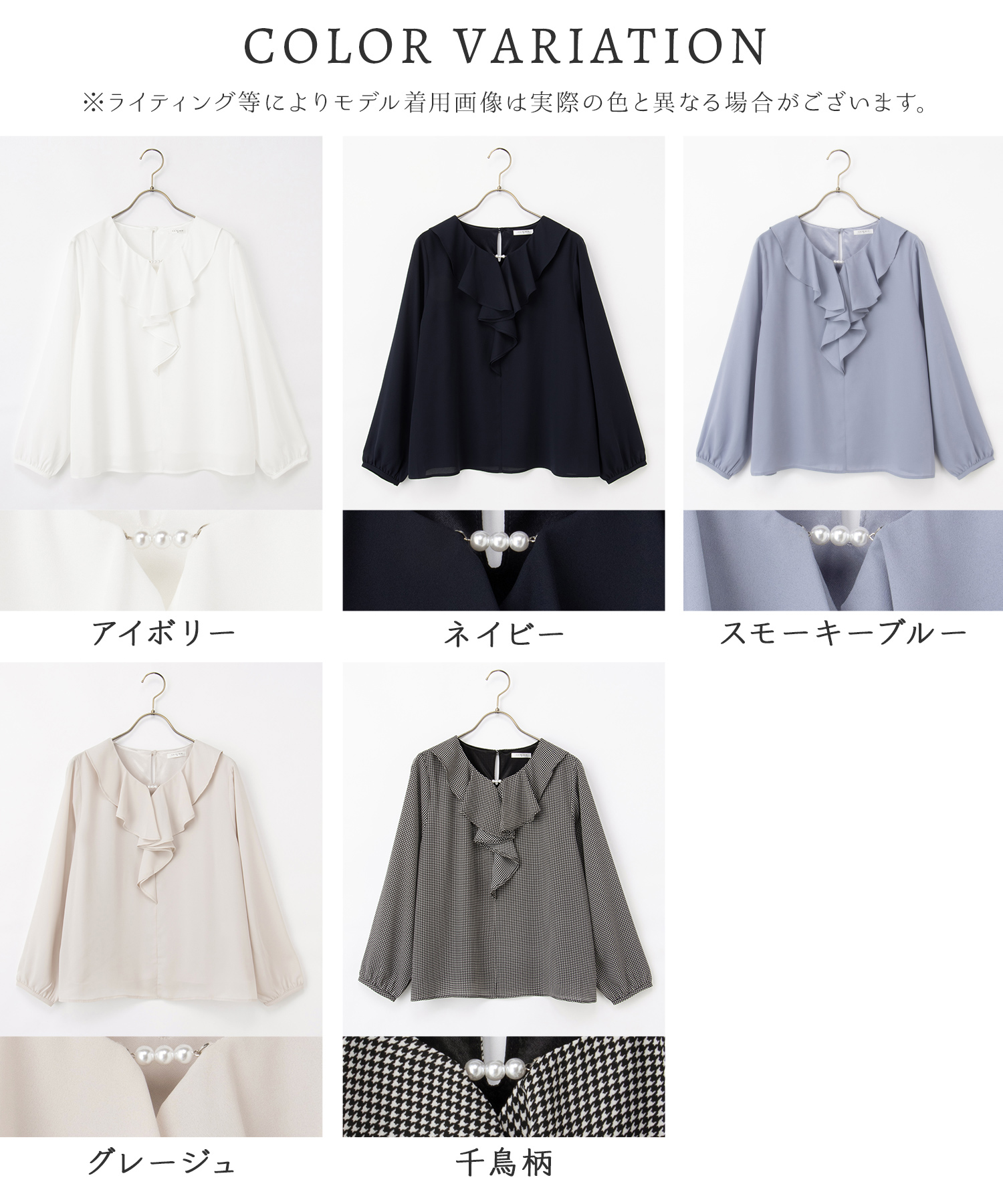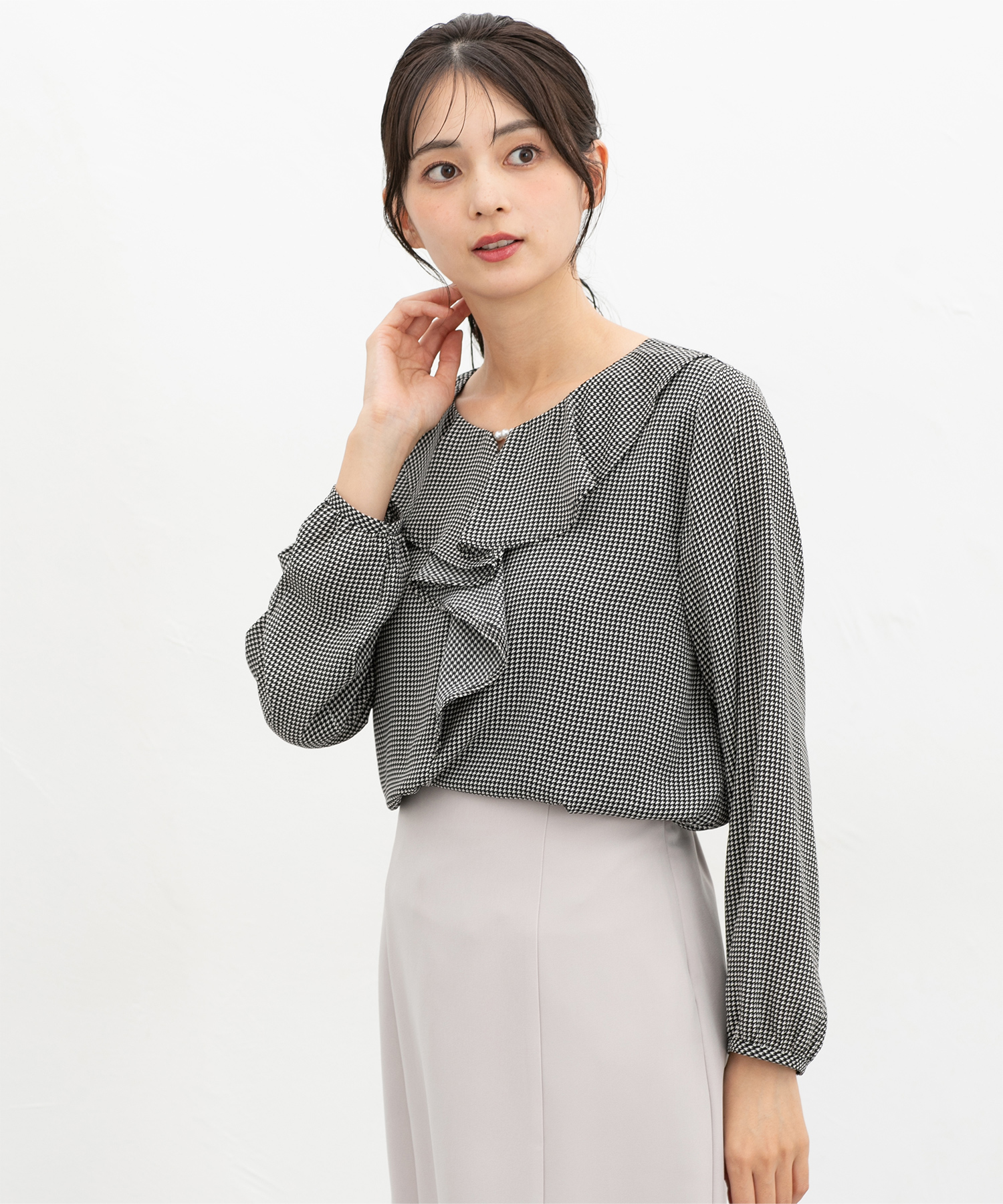 トップス ブラウス 長袖 大きいサイズ オフィス きれいめ フリル ラッフルフリル 無地 千鳥柄 レディース Honeys ハニーズ ラッフルフリルブラウス