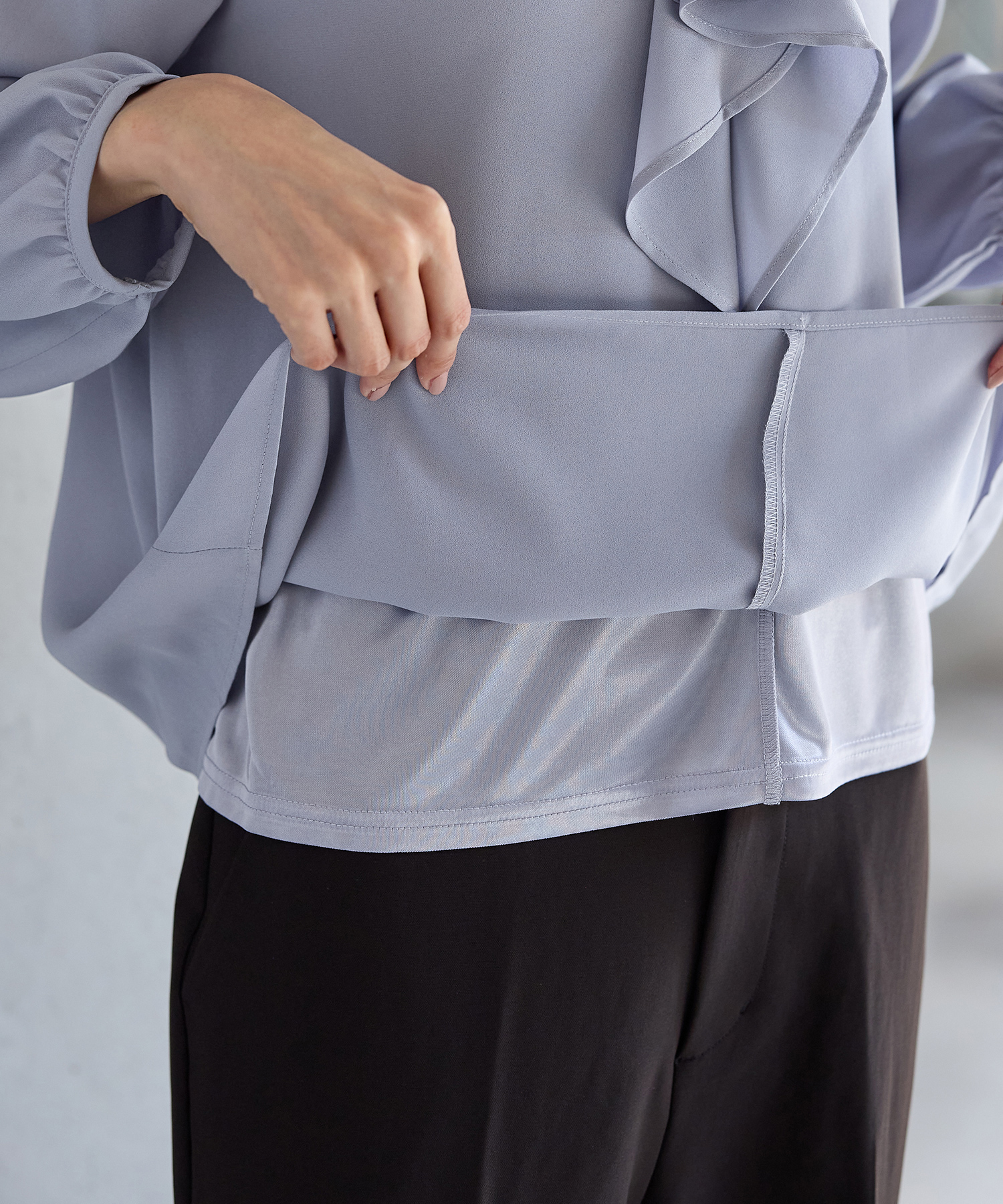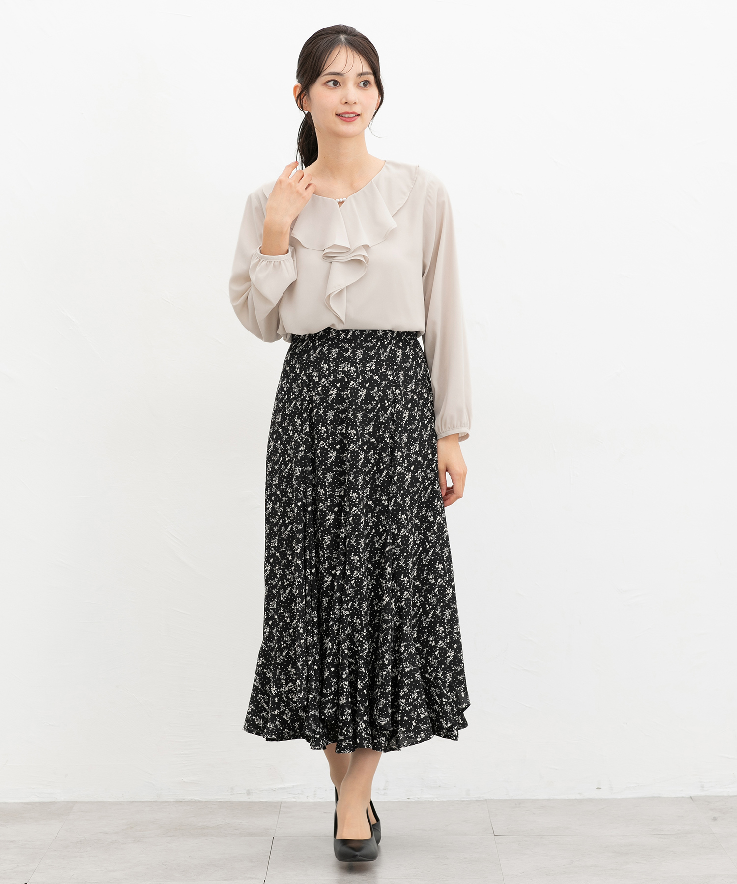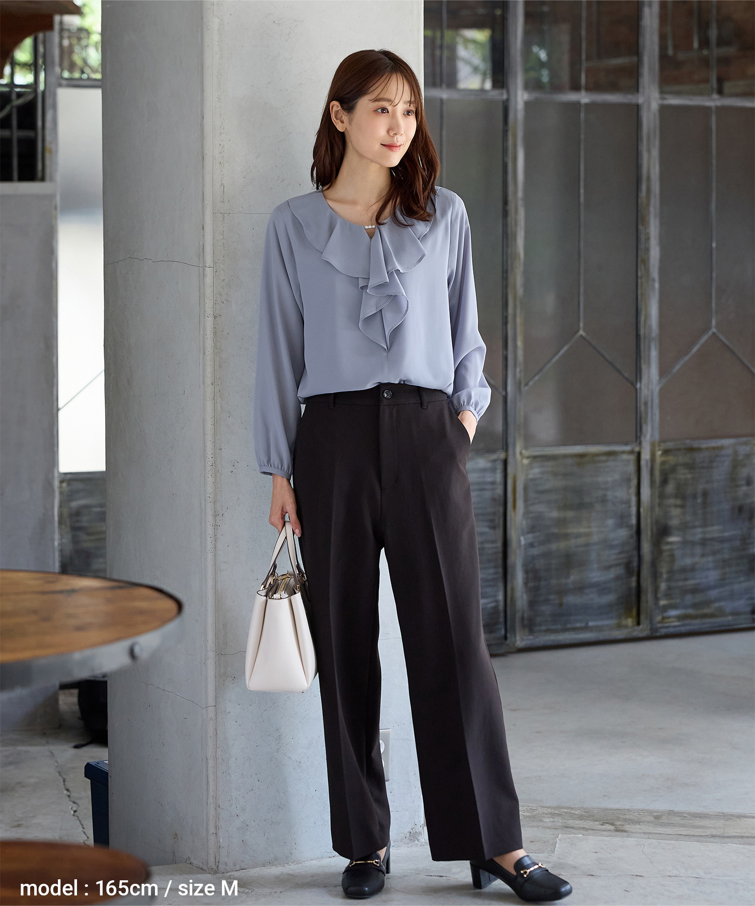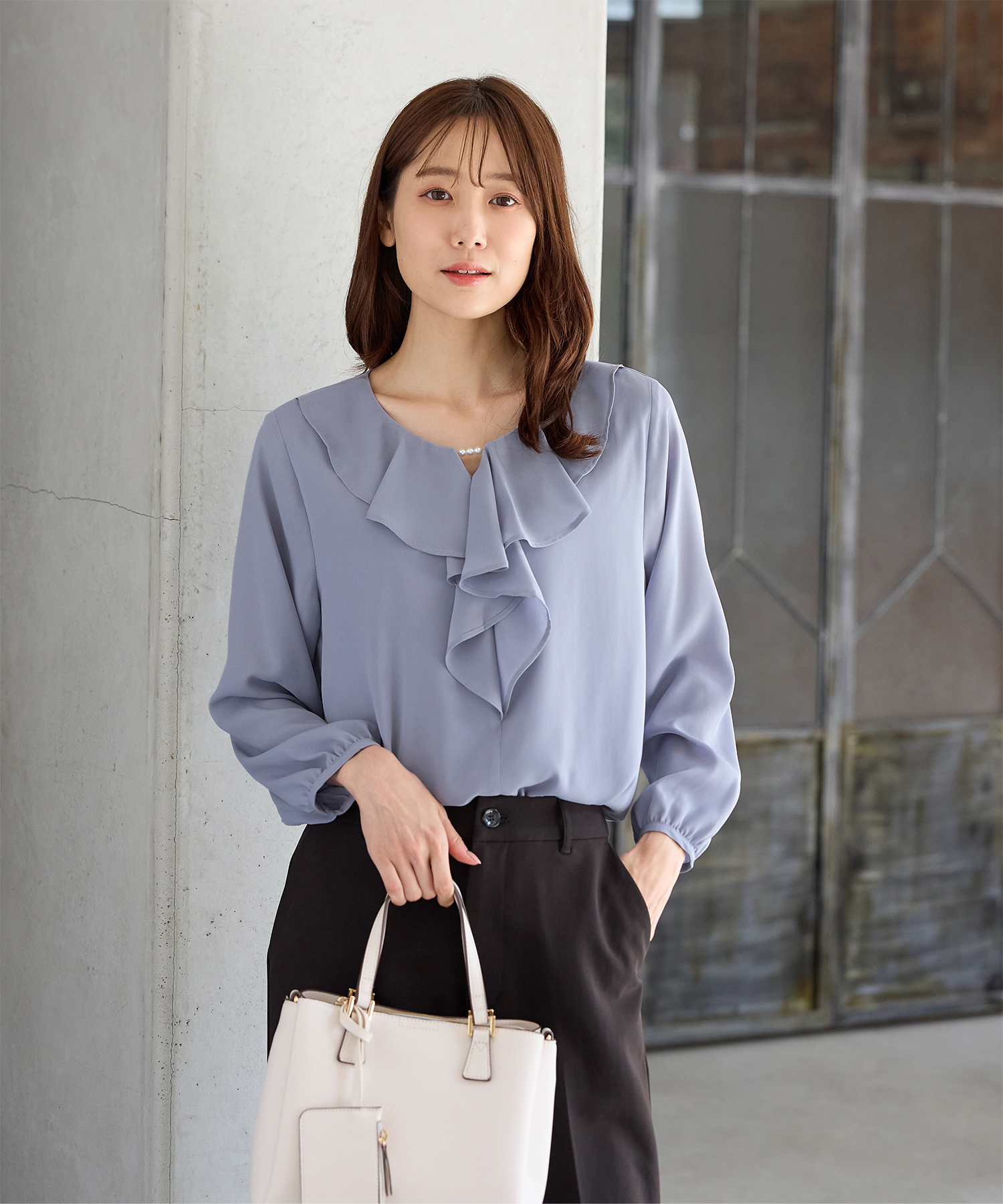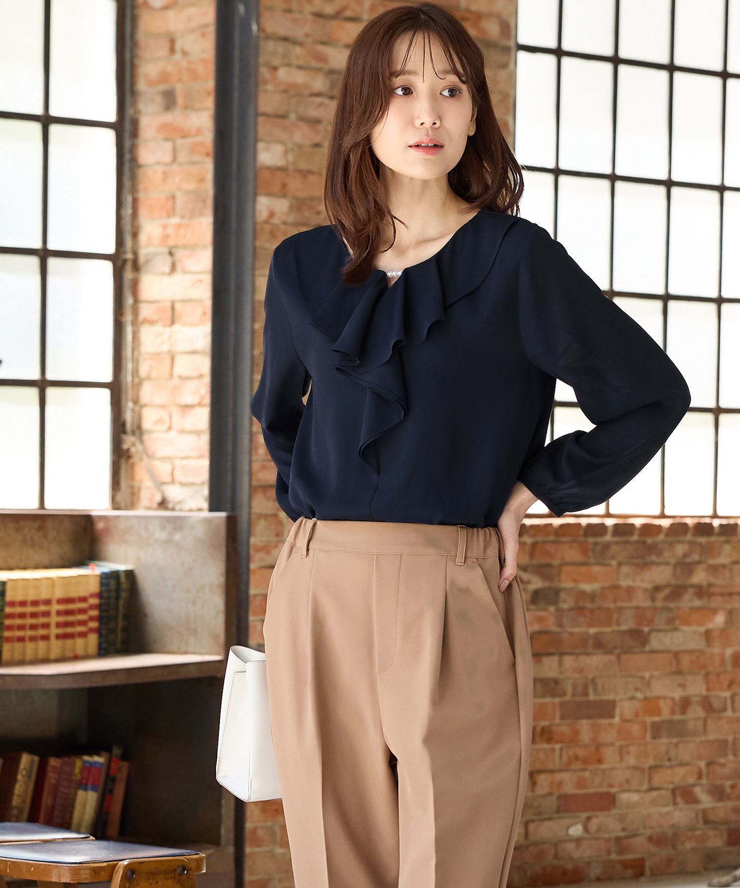 トップス ブラウス 長袖 大きいサイズ オフィス きれいめ フリル ラッフルフリル 無地 千鳥柄 レディース Honeys ハニーズ ラッフルフリルブラウス