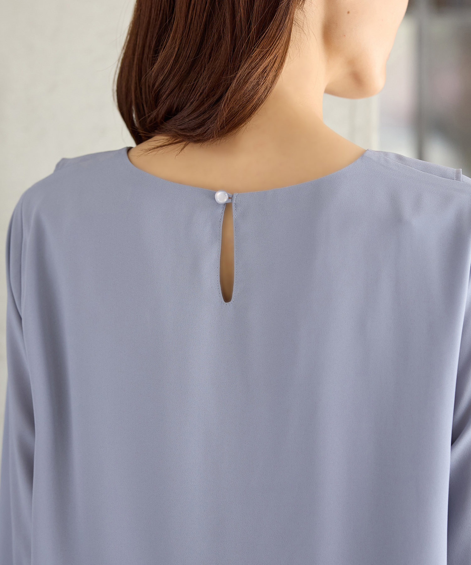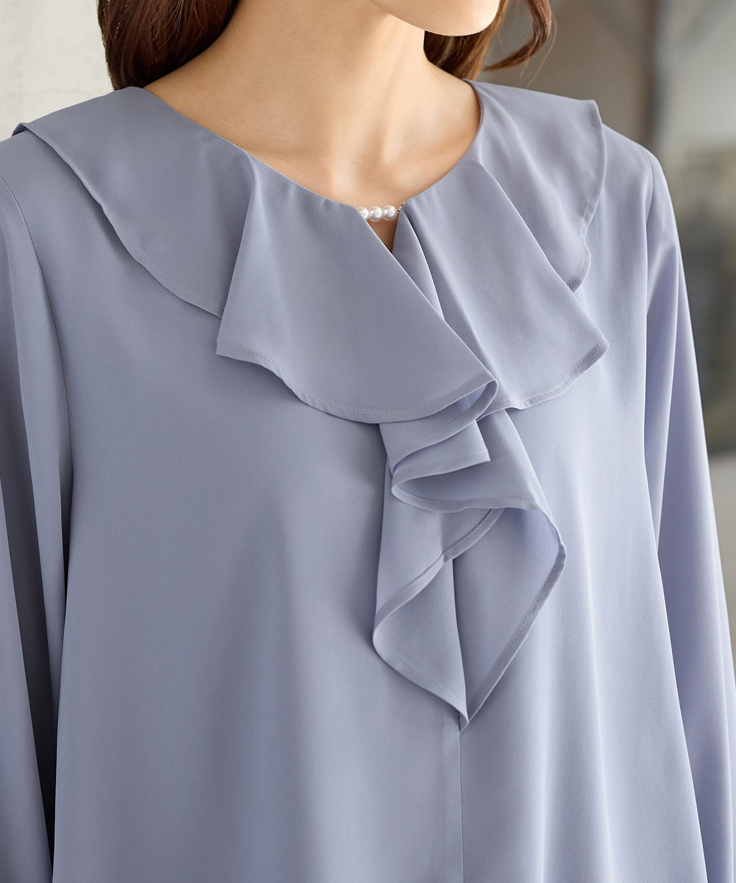 流れるようなドレープのラッフルフリルにパール風ビーズをプラスした、華やかで上品なデザイン。
