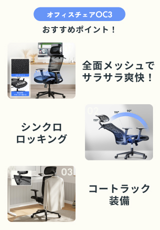 ・通気性MAXの全メッシュ素材、長時間でも快適!長時間座っても蒸れにくく、快適な座り心地をキープします。暑い季節もさらっと快適に。