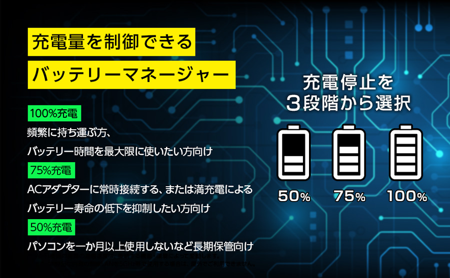 バッテリーマネージャーによる充電容量の設定が可能(100% / 75% / 50%から選択)