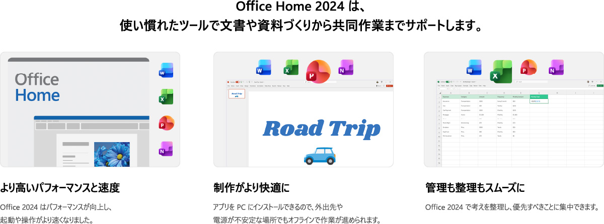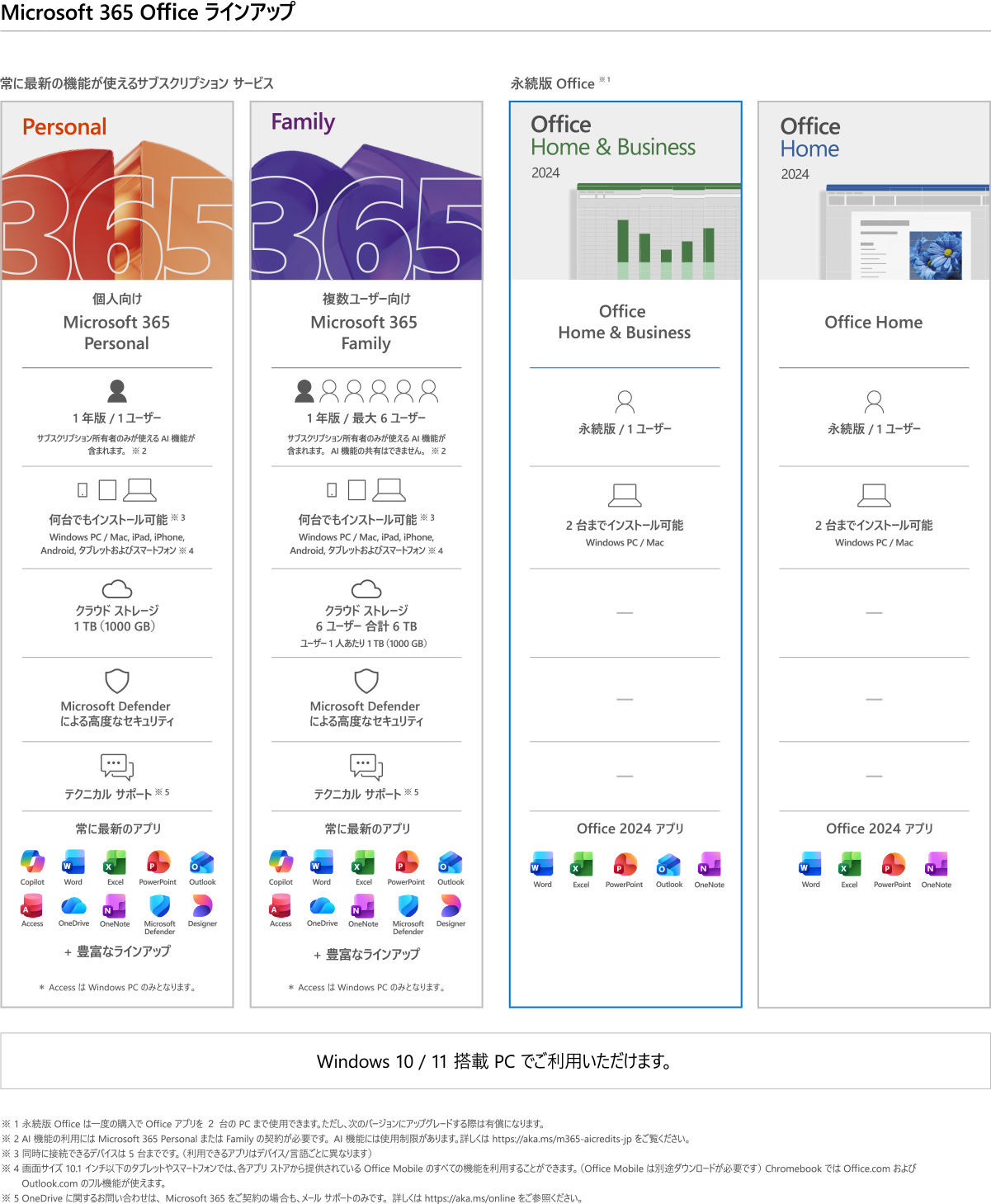 Office 2024 は 1 回限りの購入版、Microsoft 365 はサブスクリプション製品です。Microsoft 365 には Office デスクトップ アプリが含まれ、それらで AI 機能を活用できます。(AI 機能に利用制限があります。詳しくは aka.ms/m365-aicredits-jp をご覧ください。) また 1 TB のクラウド ストレージ、セキュリティ アプリ Microsoft Defender、Windows や Office アプリに関する継続的なテクニカル サポートが利用できます。