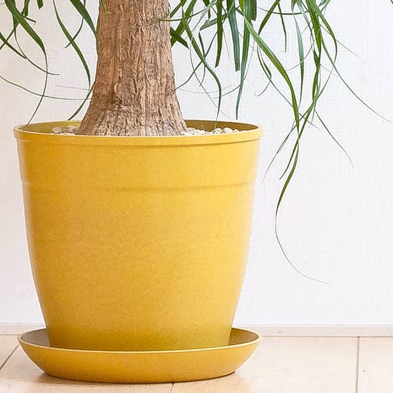 鉢は「米のもみ殻」を主原料とした、エコ素材です。一般的な鉢と比べ、ややくすんだ色。それがインテリアに馴染みやすく、大人気の鉢となります。こちらのタイプは、白鉢のポニーテールを植え替えたタイプとなります。