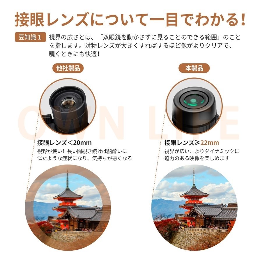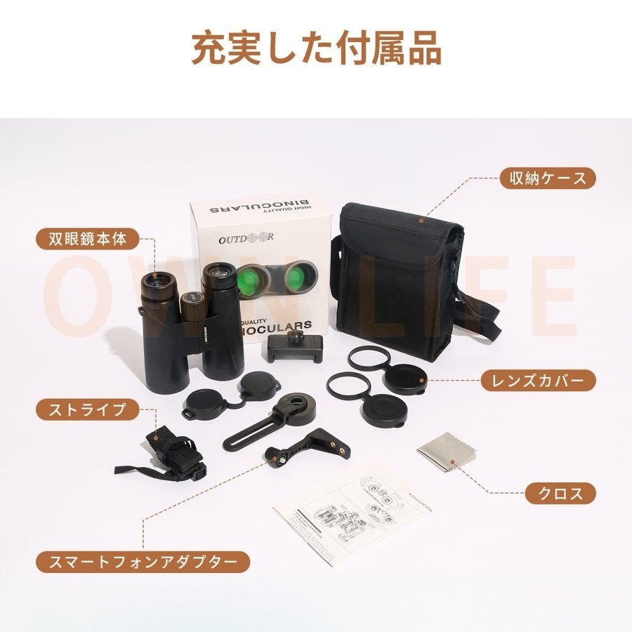 ・パッケジ内容:双眼鏡×1、収納バッグ×1、ストラップ×1、スマートフォンアダプター×1、接眼レンズカバー×1、対物レンズカバー×1、拭き布×1
