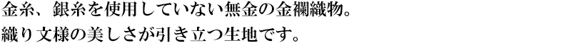 金襴生地は日本の伝統的な技法を用い、金糸や色糸を贅沢に織り込んだ格式ある国産生地であり