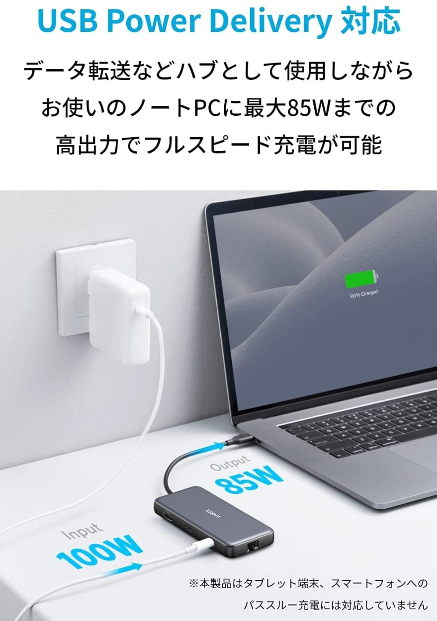 データ転送やHDMI接続などハブとして使用しながらも、お使いのノートPCに最大85Wまでの高出力でフルスピード充電が可能です。(15W出力はハブ自体への給電に利用されるため、最大入力は100W、最大出力は85Wです)