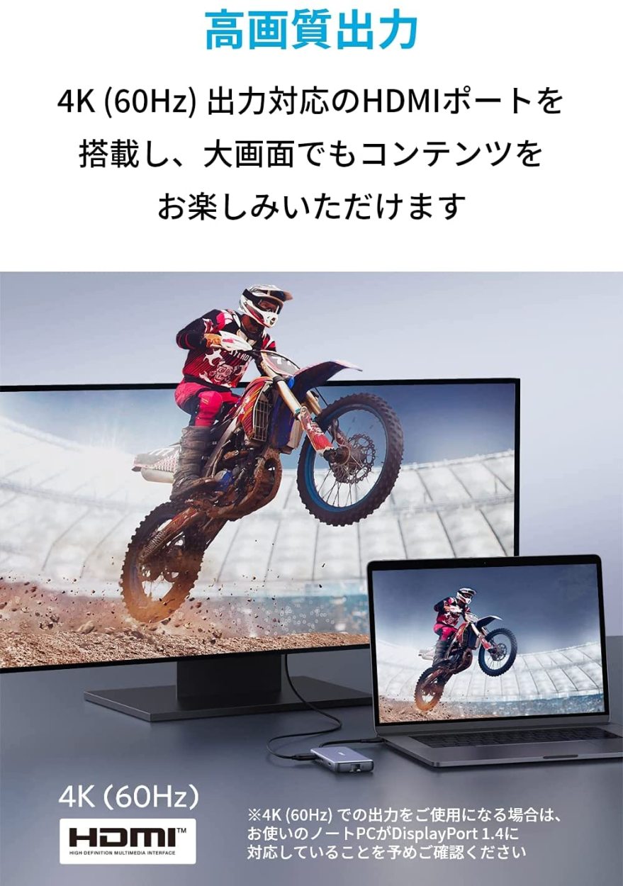 HDMIポートは、1080p、1080i、720p、480p等の最大4K (60Hz) までの様々な解像度に対応しています。4K (60Hz) での出力には、お使いの機器がDisplayPort 1.4に対応していることを予めご確認してください。