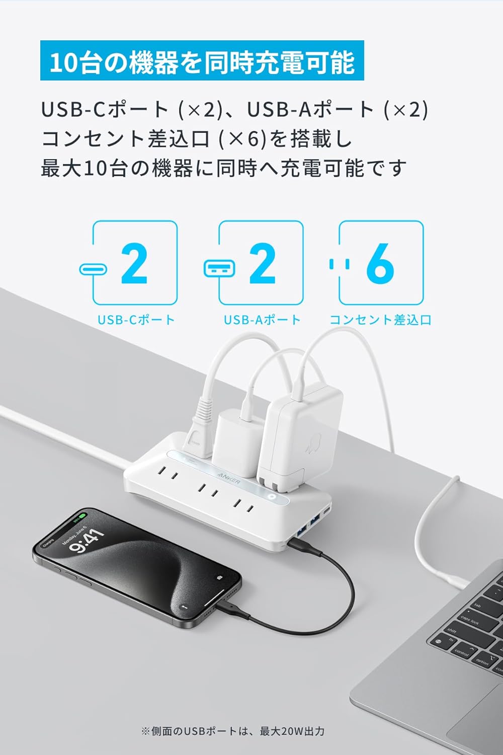 ・10台の機器を同時充電可能:USB-Cポート (×2)、USB-Aポート (×2) コンセント差込口 (×6)を搭載し、最大10台の機器に同時へ充電可能です
