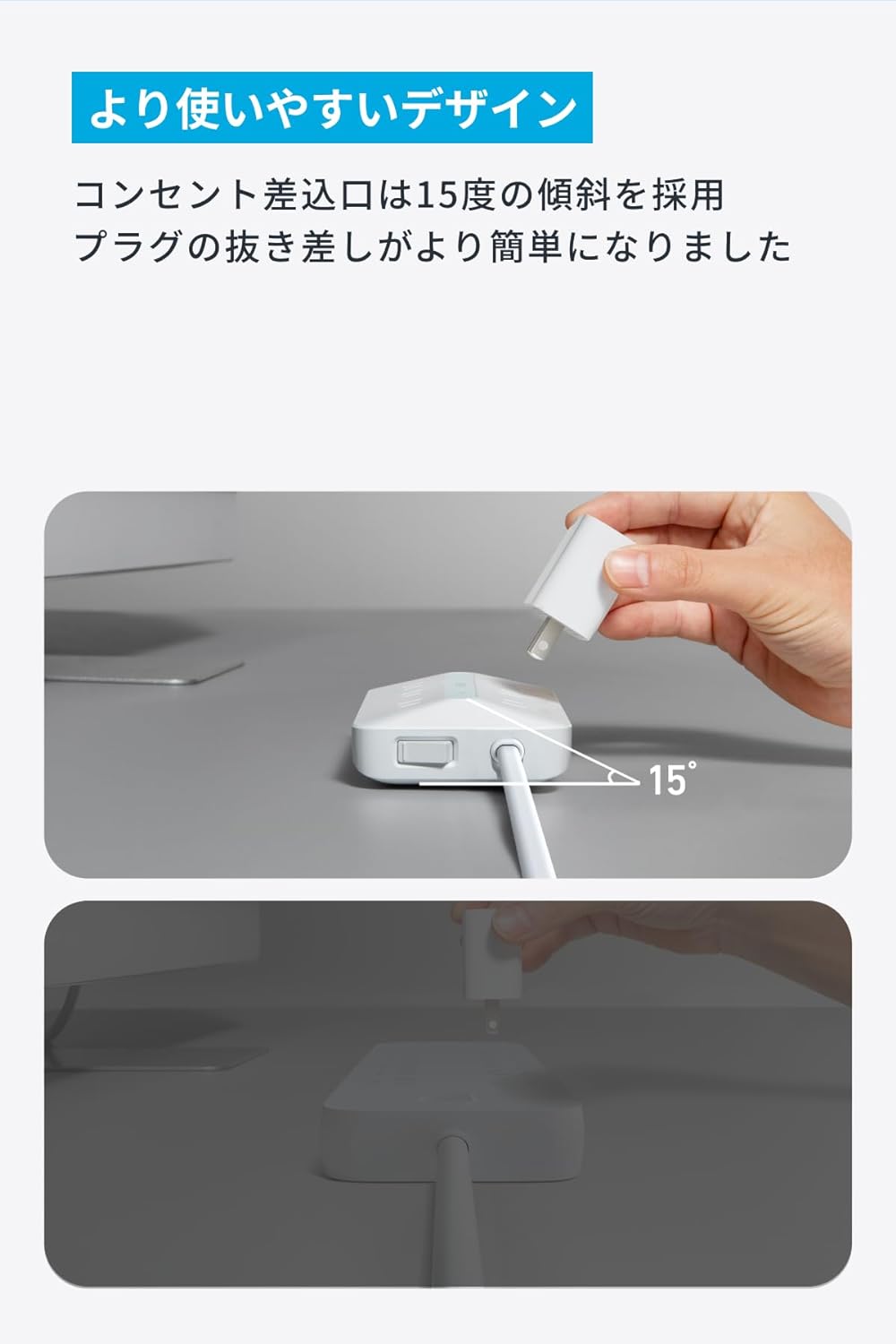 ・より使いやすいデザイン:コンセント差込口部分には15度の傾斜を採用。プラグの抜き差しがより簡単になりました。