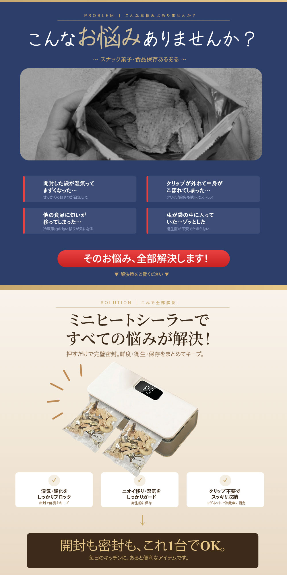 密封機能と一体化した設計で、これ1台で開封・保存が完結する多機能フードシーラーです。