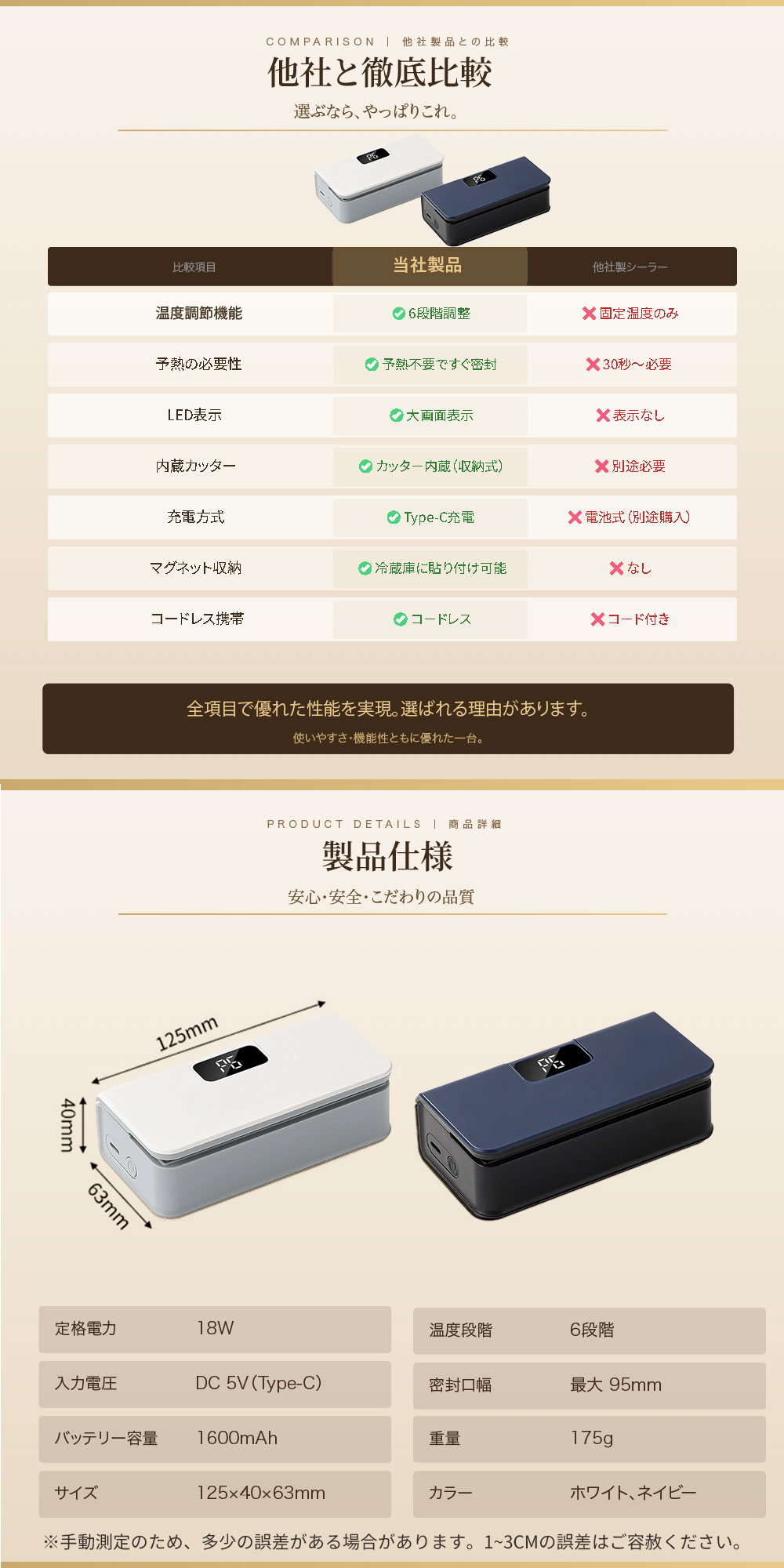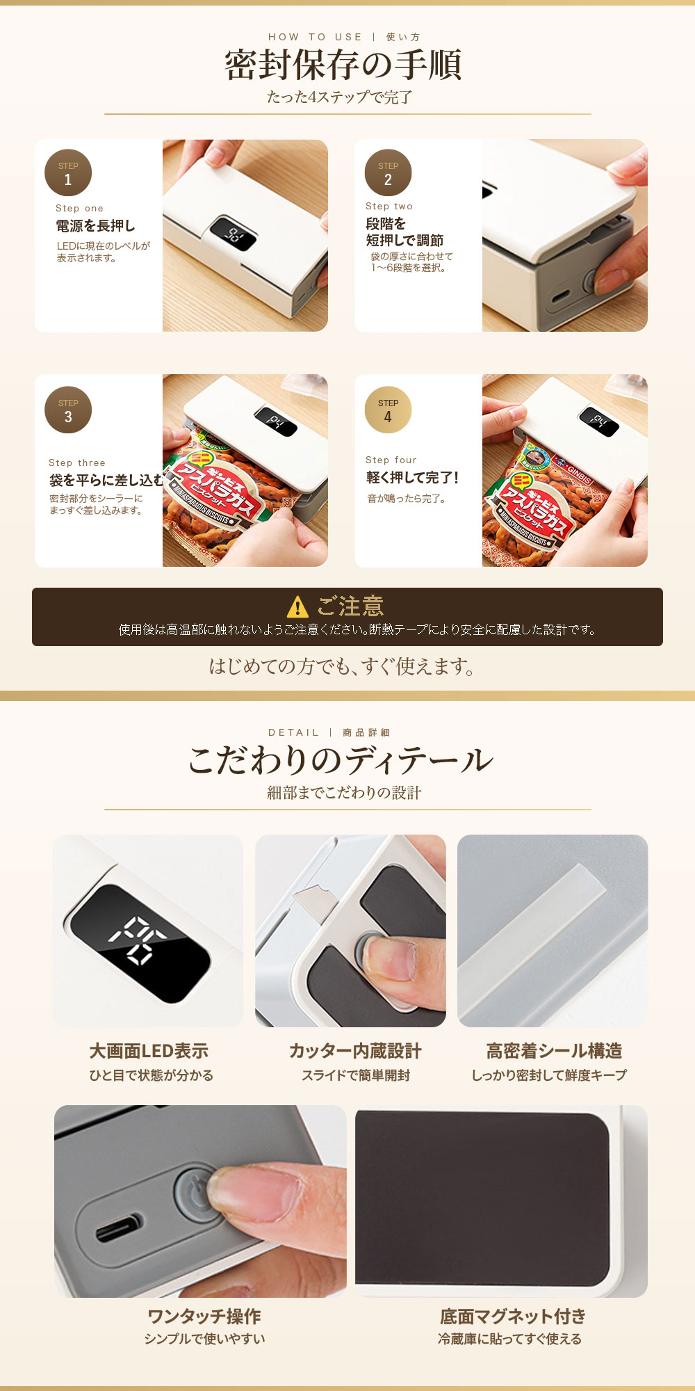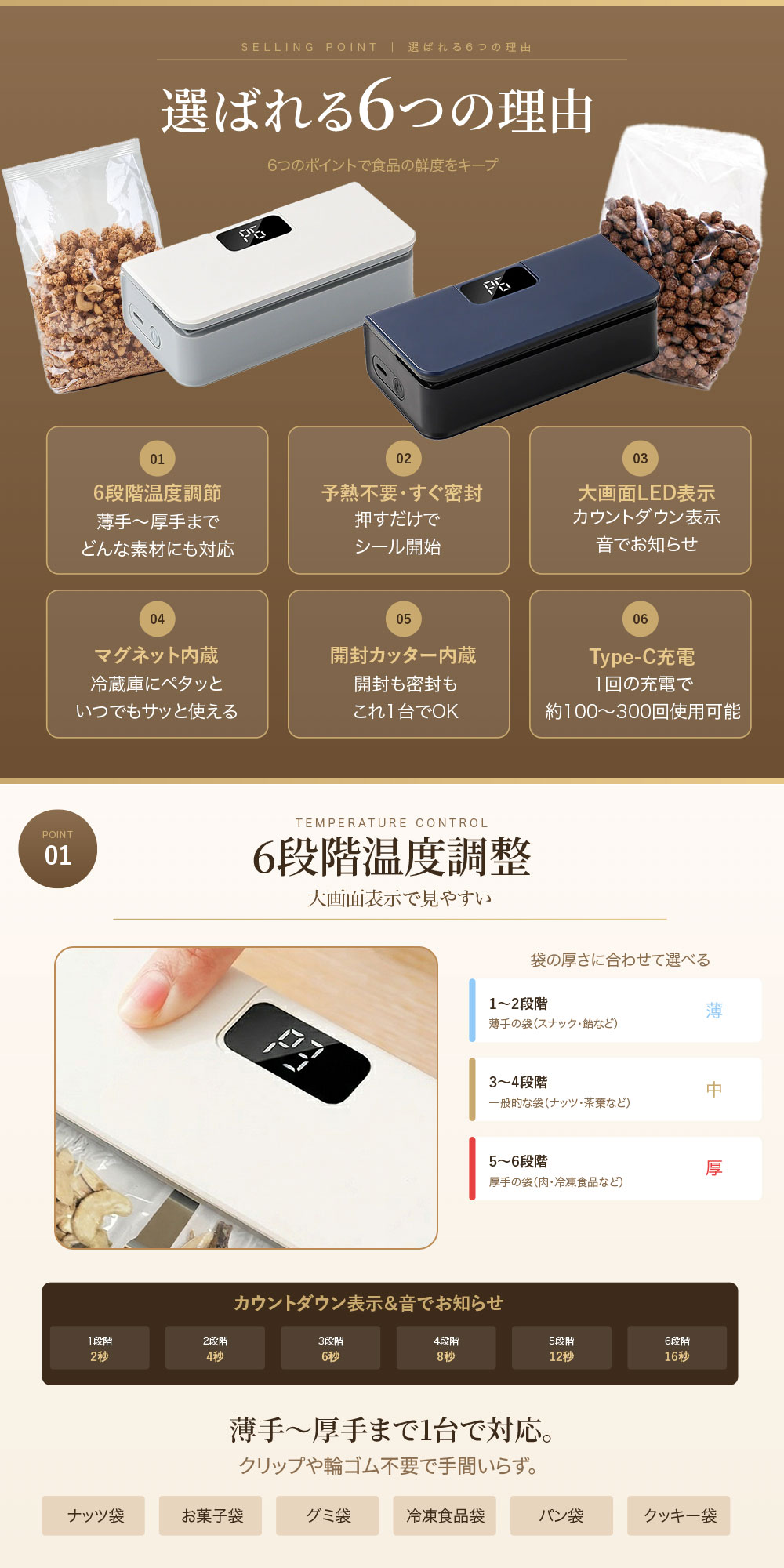 【ポイント1】6段階温度調整で幅広く対応薄手の袋から厚手の保存袋まで対応できるヒートシーラー。6段階温度調整機能により、お菓子袋・冷凍食品袋・パン袋など様々な袋にしっかり密封できます。