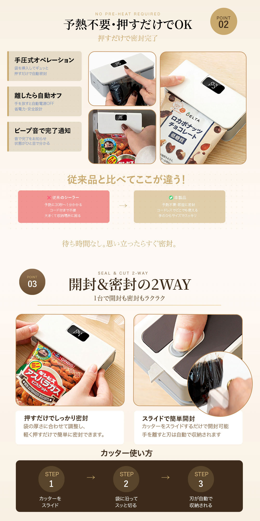 【ポイント2】予熱不要・押すだけで簡単密封面倒な予熱は不要、ボタンを押すだけですぐに使用可能。ミニシーラーだから誰でも簡単に使え、時短&ストレスフリーで食品保存ができます。