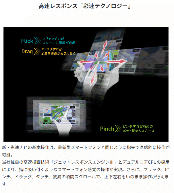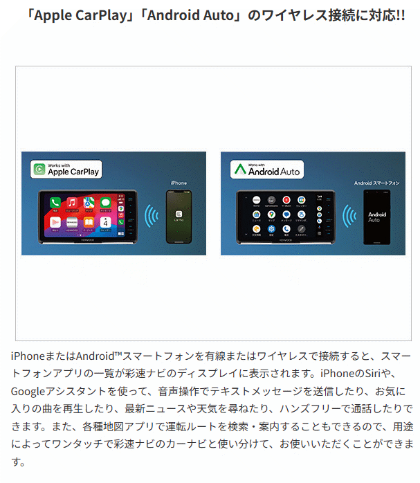 ・Apple CarPlay / Android Auto にワイヤレスで対応!彩速ナビとスマホのナビアプリはワンタッチ切り替えにも対応