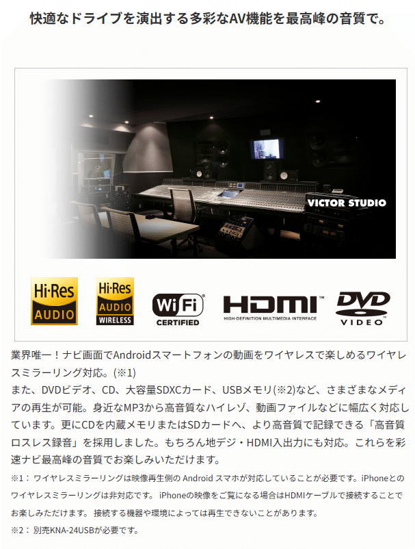 ・スマホなどの動画をナビの大画面でハイビジョンを楽しめる、ワイヤレスミラーリングに対応