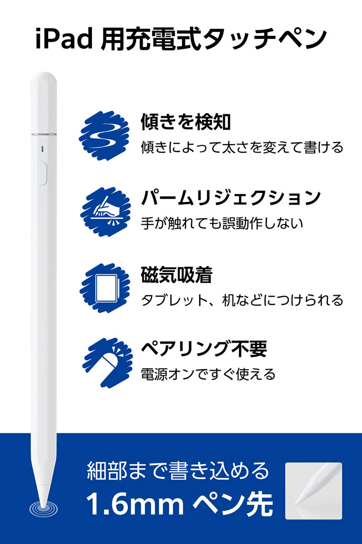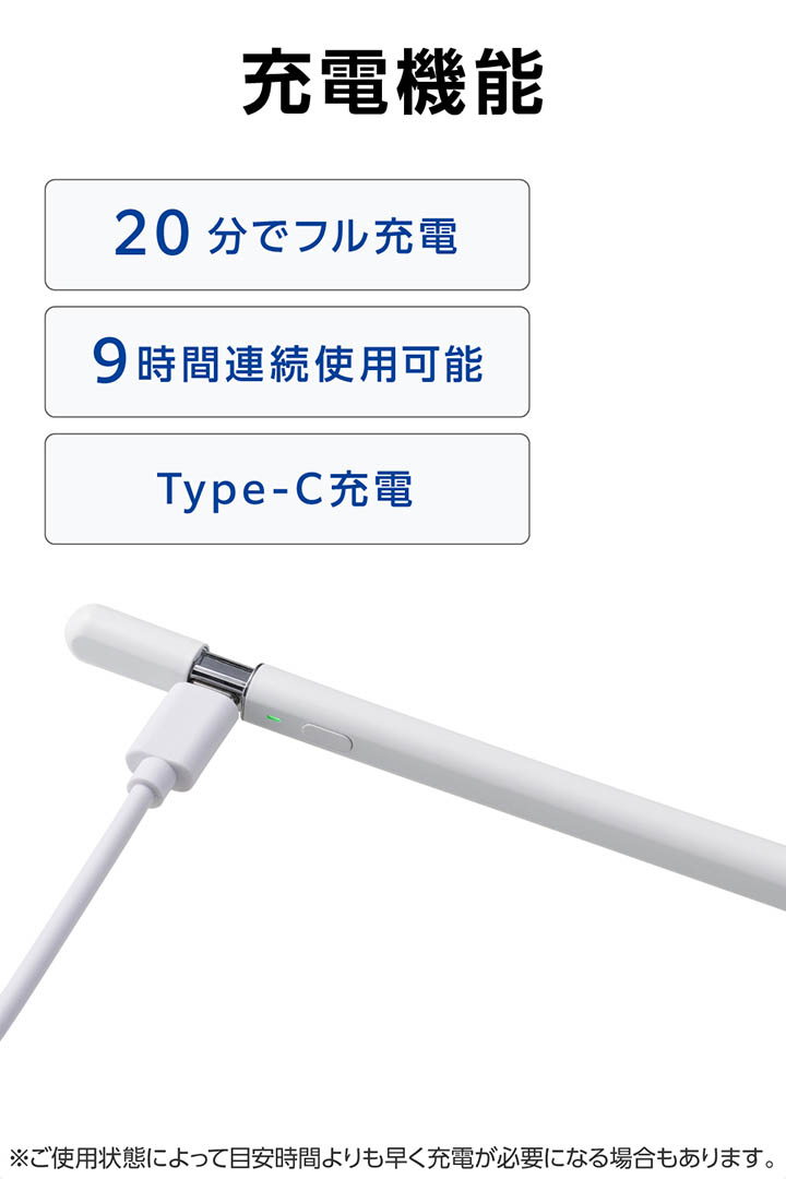 ■隙間時間の充電ですぐに使える!約20分でフル充電可能な急速充電機能を搭載した、iPad用アクティブタッチペンです。ポート部分には、ホコリの侵入を防ぐカバーが付き。約1.6mmのペン先で細かい作業、メモや絵を描くのにおすすめです。ペンの傾き具合で線の太さを変えられる機能や、誤動作を防止するパームリジェクションにも対応しています。