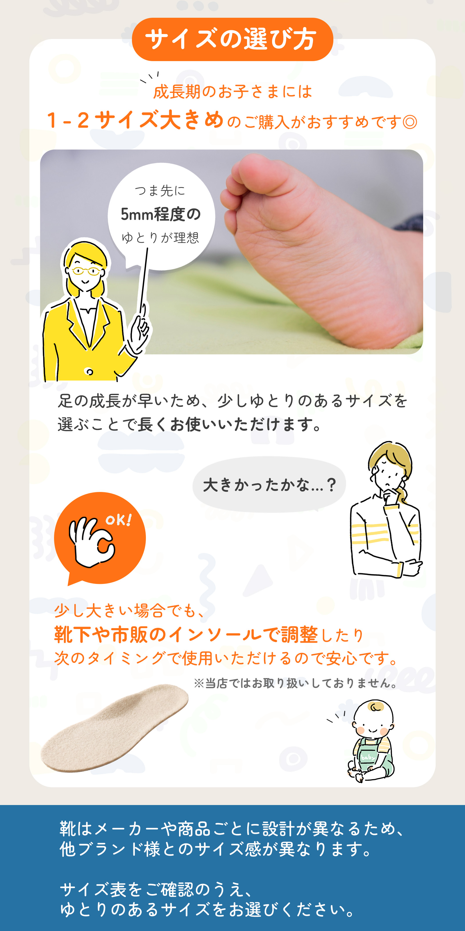 足の形や成長には個人差がございますので、ゆとりを持ったサイズ選びをおすすめします。