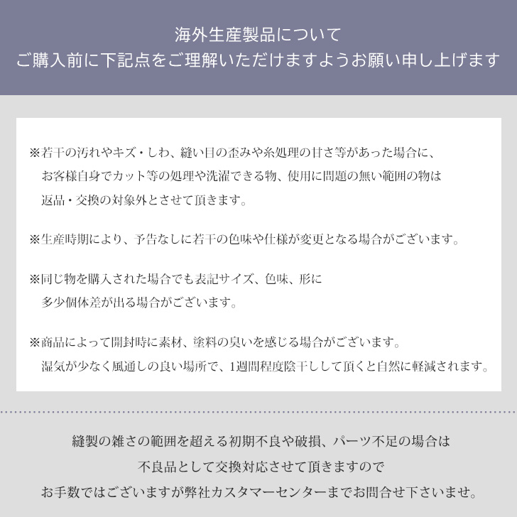 ■注意事項1:商品の開封時に素材の臭いを感じる場合がございます。湿気が少なく風通しの良い場所で、一週間程度陰干しして頂くと自然に軽減されます。