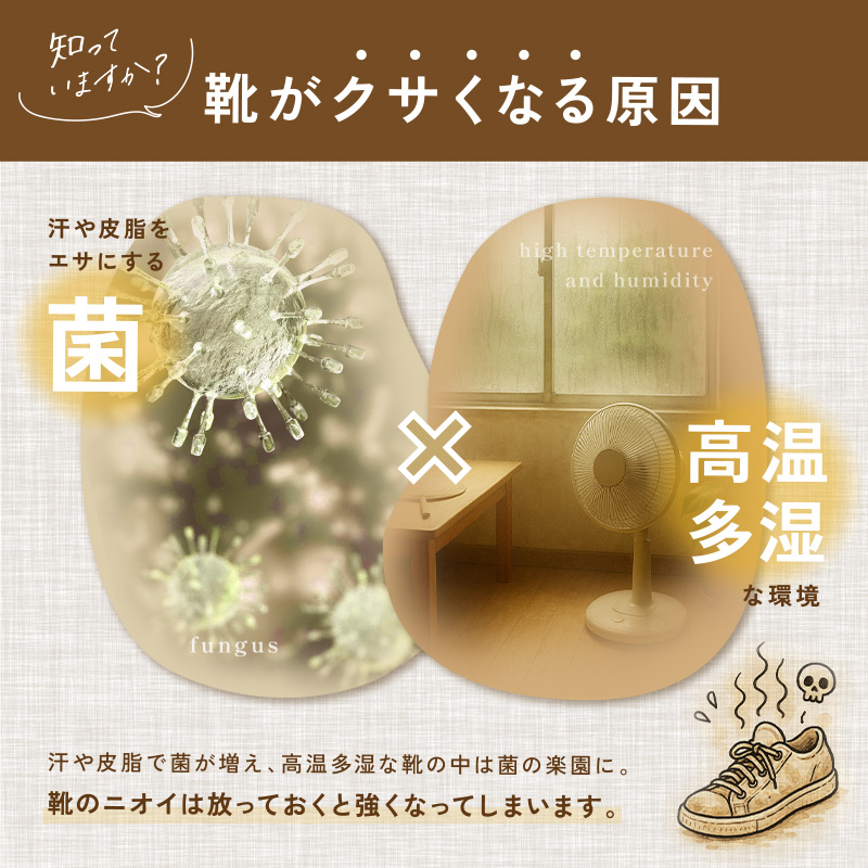 靴のニオイの原因となる菌や、高温多湿で蒸れやすい靴内部の環境にアプローチ。