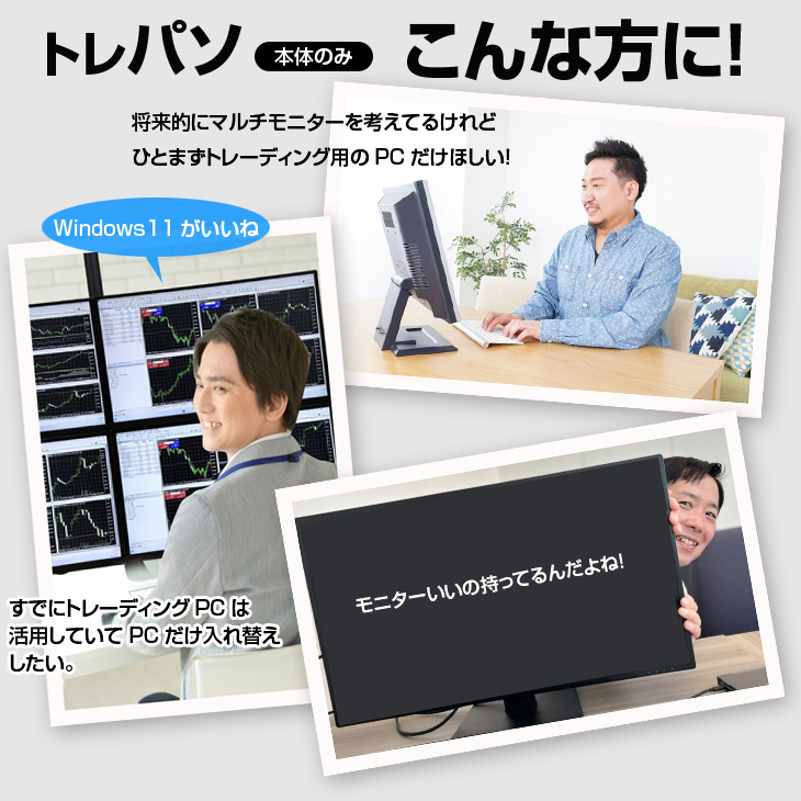モニターをお持ちの方、すでにトレーディングPCをお使いでWindows11化やスペックアップを希望などPCだけを入れ替えたい方におすすめの本体のみのモデルです。