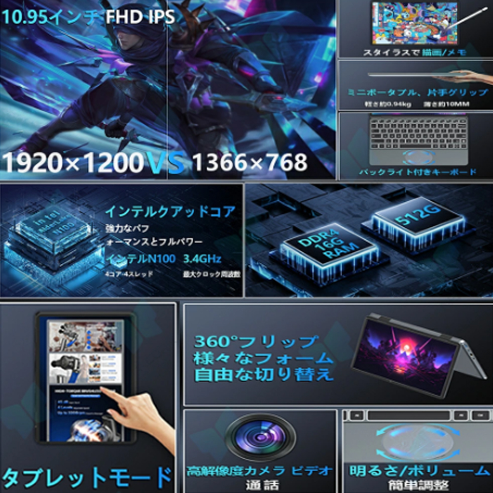 約11インチのコンパクトなボディにはタッチスクリーンと360°回転できるデザインが搭載されており,約0.9KGの軽量設計で、自宅でのリモートワークから出張や旅行まで、あらゆるシーンで活躍するおすすめのノートパソコンです。