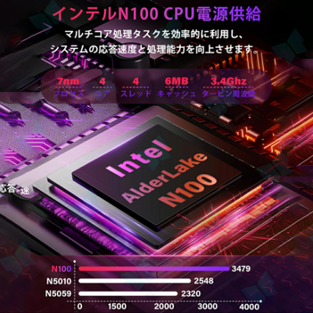 は、Intel N100低消費電力CPUを搭載しており、N5100、N95、N97などのシリーズCPUと比較して、優れたパフォーマンスを提供します。