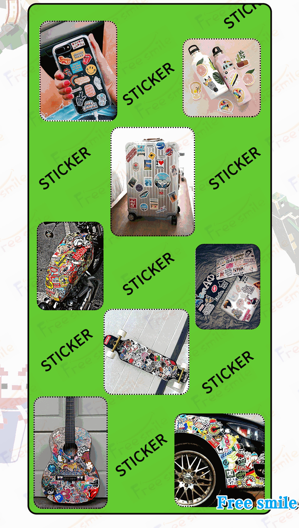 使用方法 まずは滑らかな表面をきれいにし、その後、お気に入りのステッカーを選択してその上に貼ります。