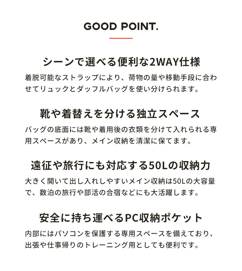 関連ワード:ボストン カバン バックパック リュック 2WAY 50L 50リットル ブランド トレーニング ジム シンプル スポーツ スポーティ かばん 鞄 大容量 はっ水 撥水 旅行 部活 通学