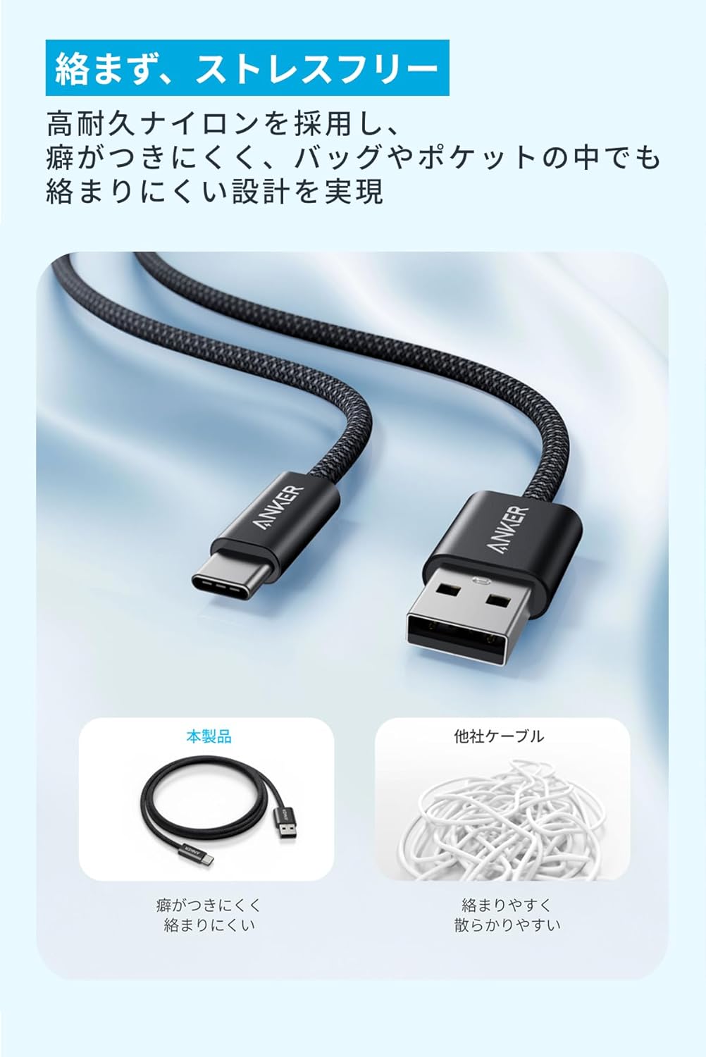 Anker Zolo USB-C & USB-A ケーブル、シリコン製結束バンド、カスタマーサポート