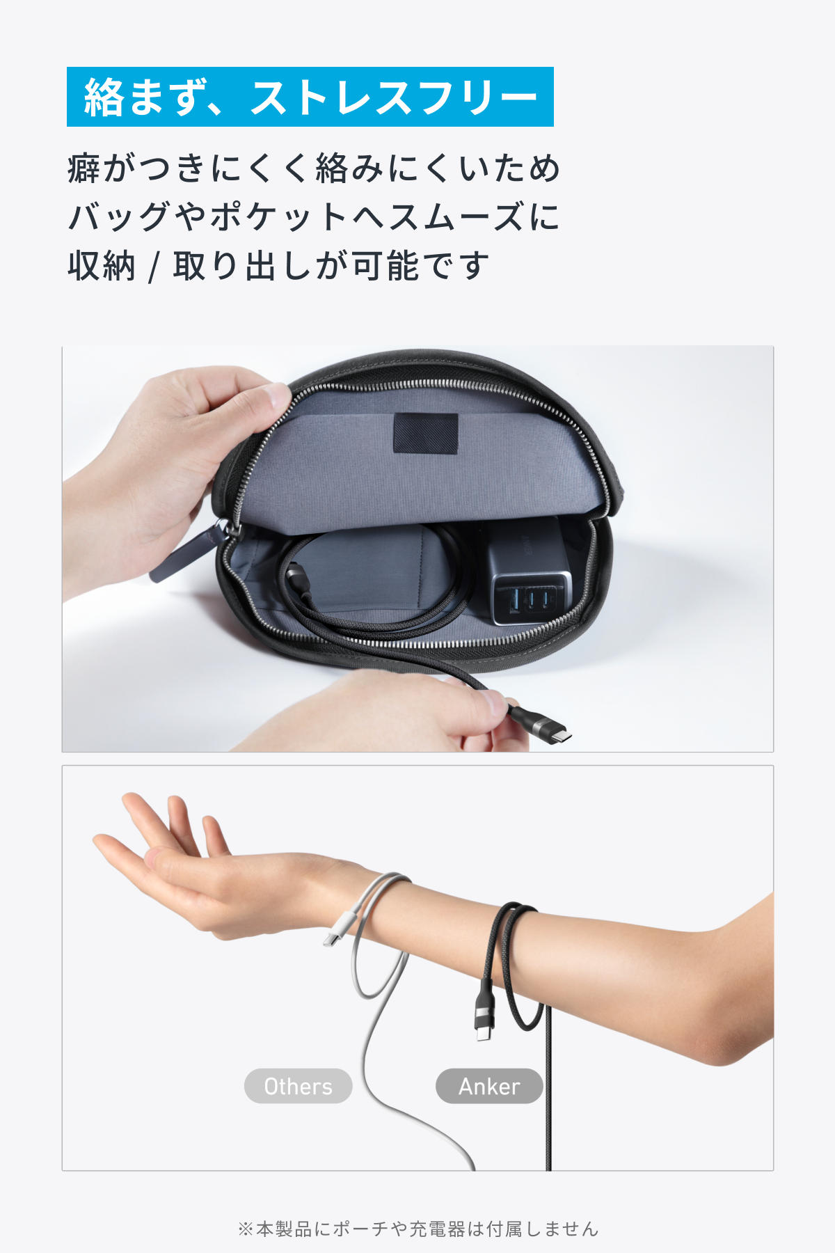・絡まず、ストレスフリー:癖がつきにくく絡みにくいため、バッグやポケットへスムーズに収納 / 取り出しが可能です。