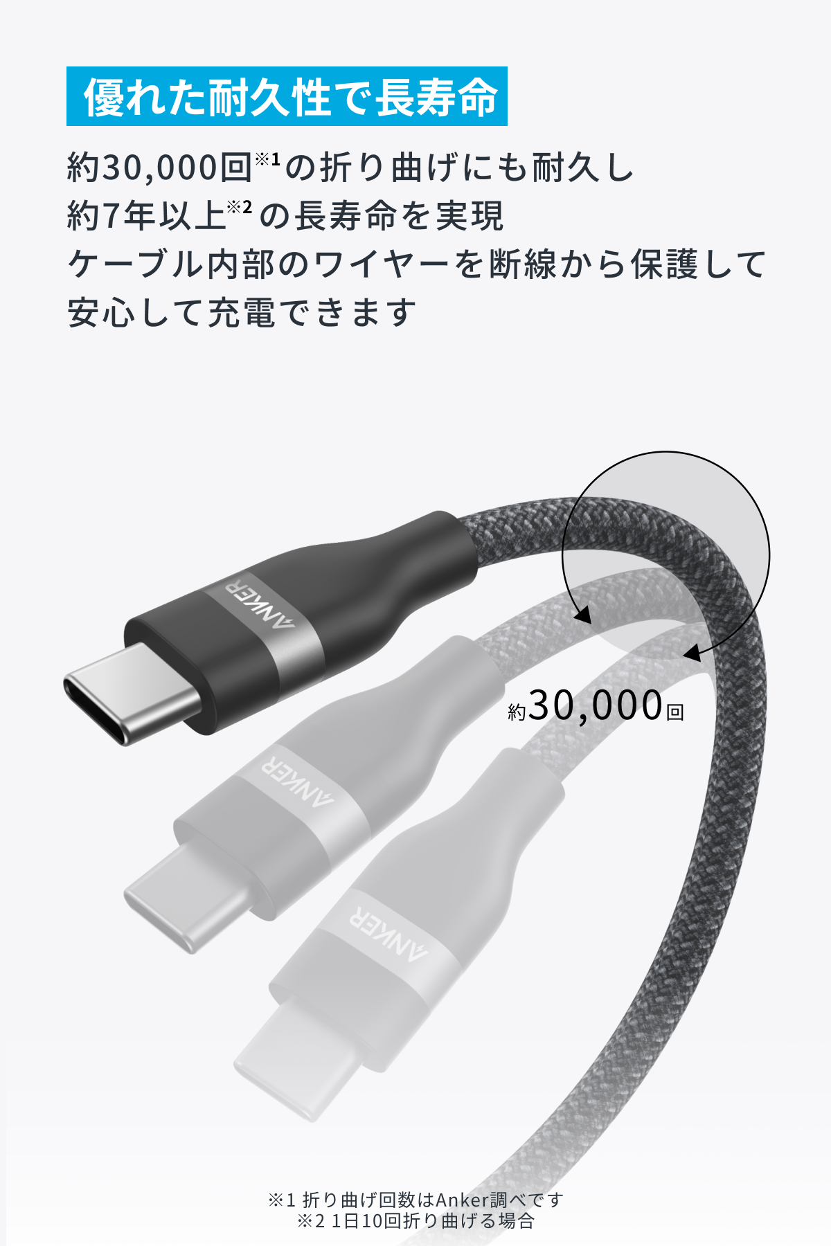 30,000回以上の折り曲げにも耐える優れた耐久性を実現しているため、ケーブル内部のワイヤーを断線から保護し、安心して使用可能な設計です。