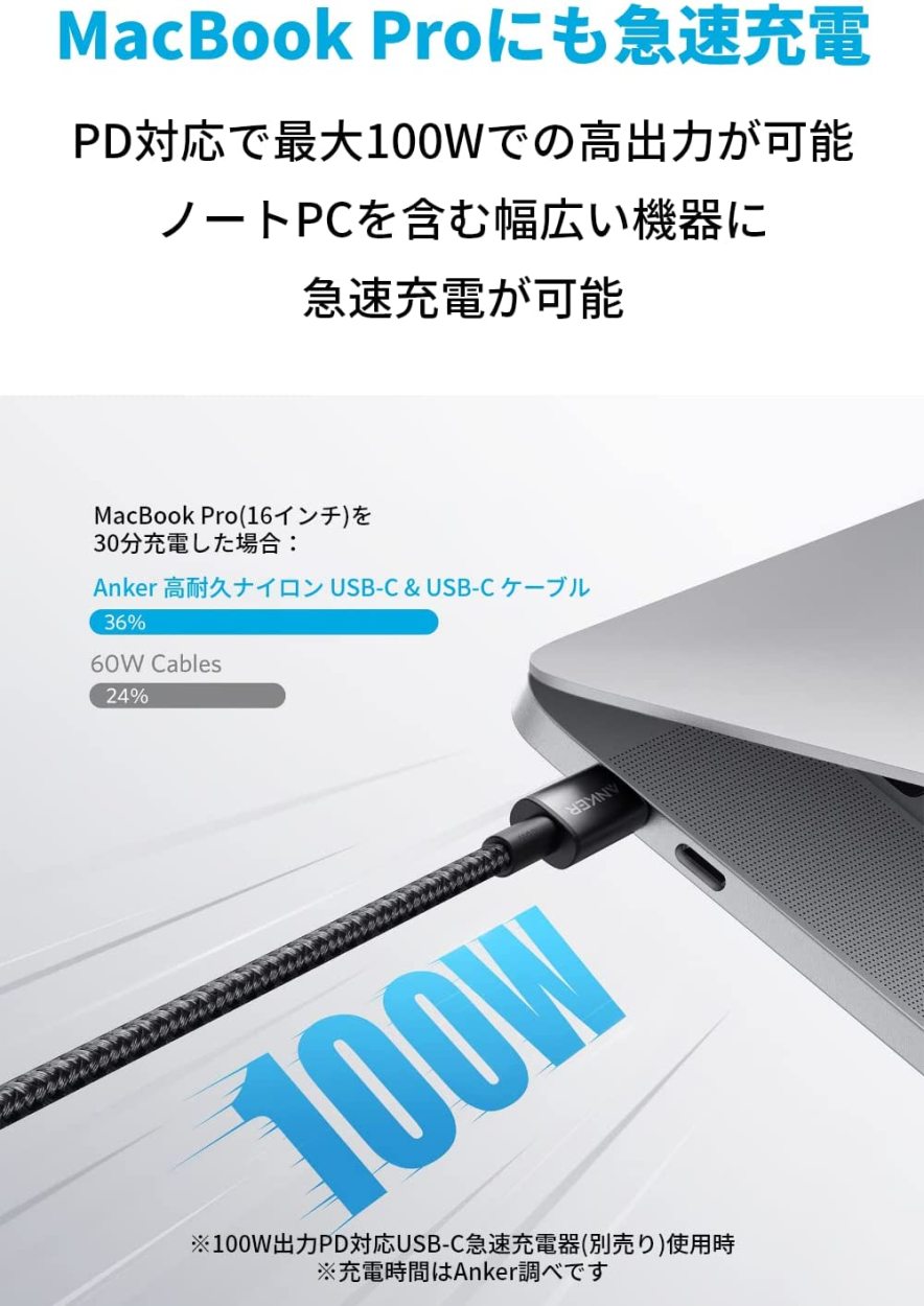 ・幅広い充電器に対応:USB Power Deliveryに対応し、幅広いUSB-C急速充電器から最大100Wの高出力でお使いの機器を充電可能です。