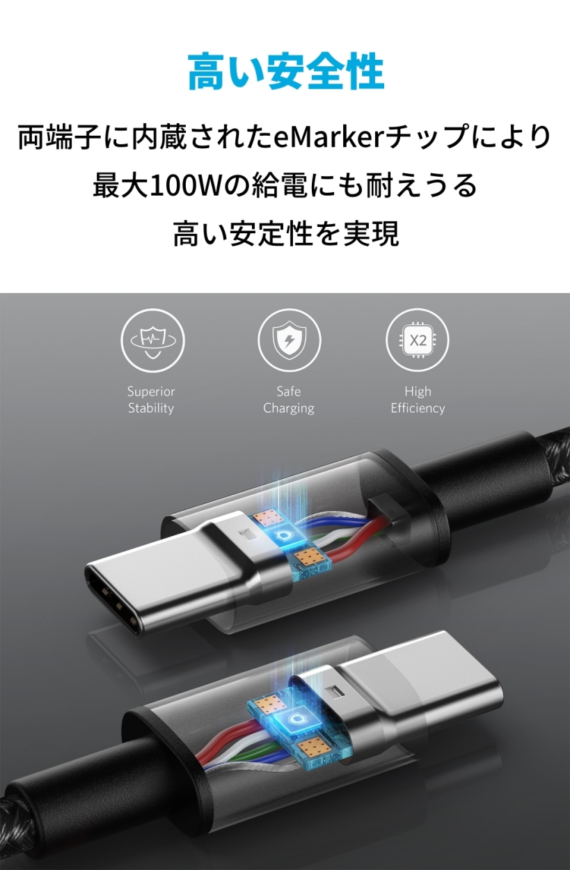 両端子に内蔵されたeMarkerチップにより、最大100Wの給電にも耐えうる高い安全性を実現しました。