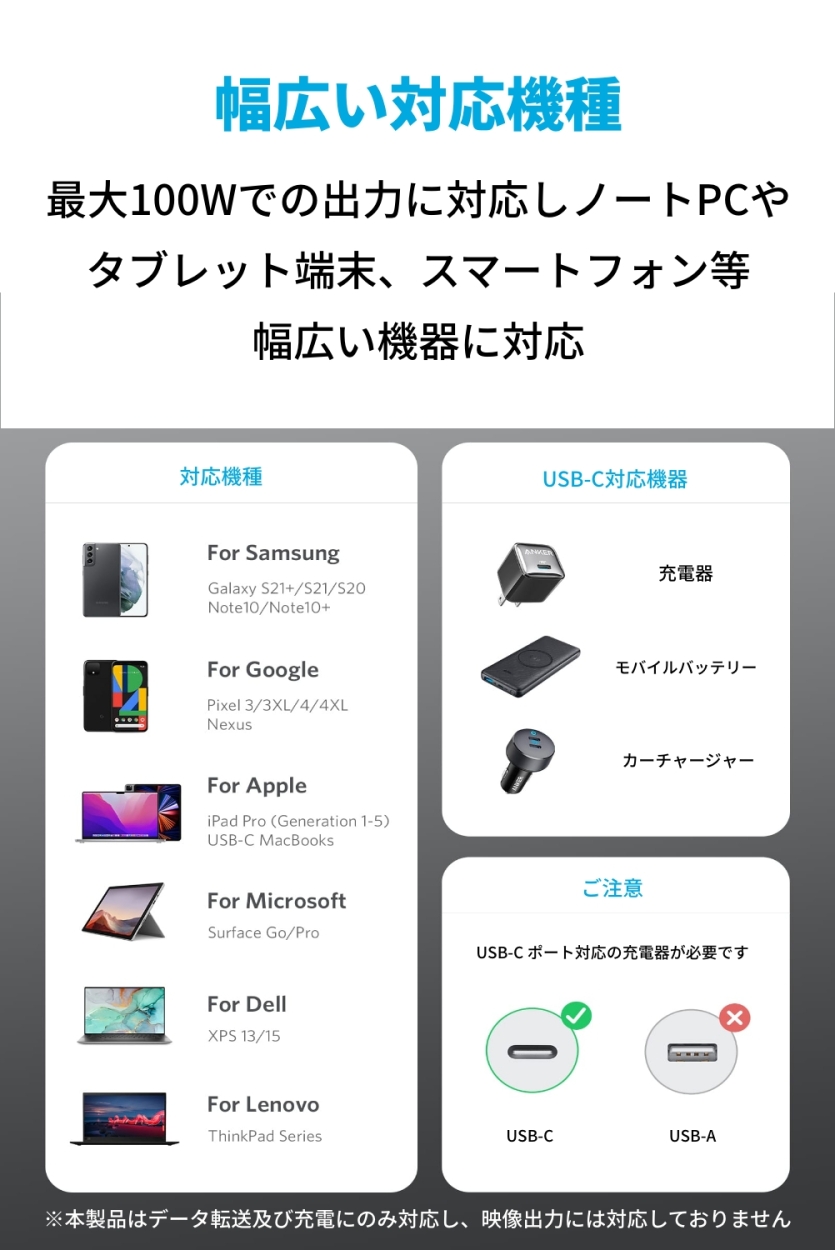 ・フルスピード充電:最大100Wの高出力に対応し、ノートPCやタブレット端末、スマートフォン等の幅広い機器にフルスピード充電が可能です。(※本製品はデータ転送及び充電にのみ対応し、映像出力には対応しておりません。)