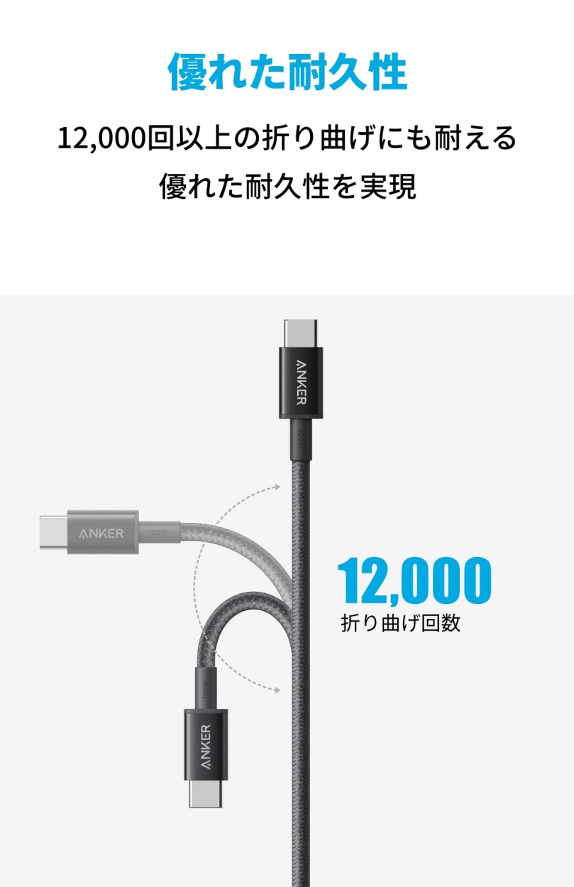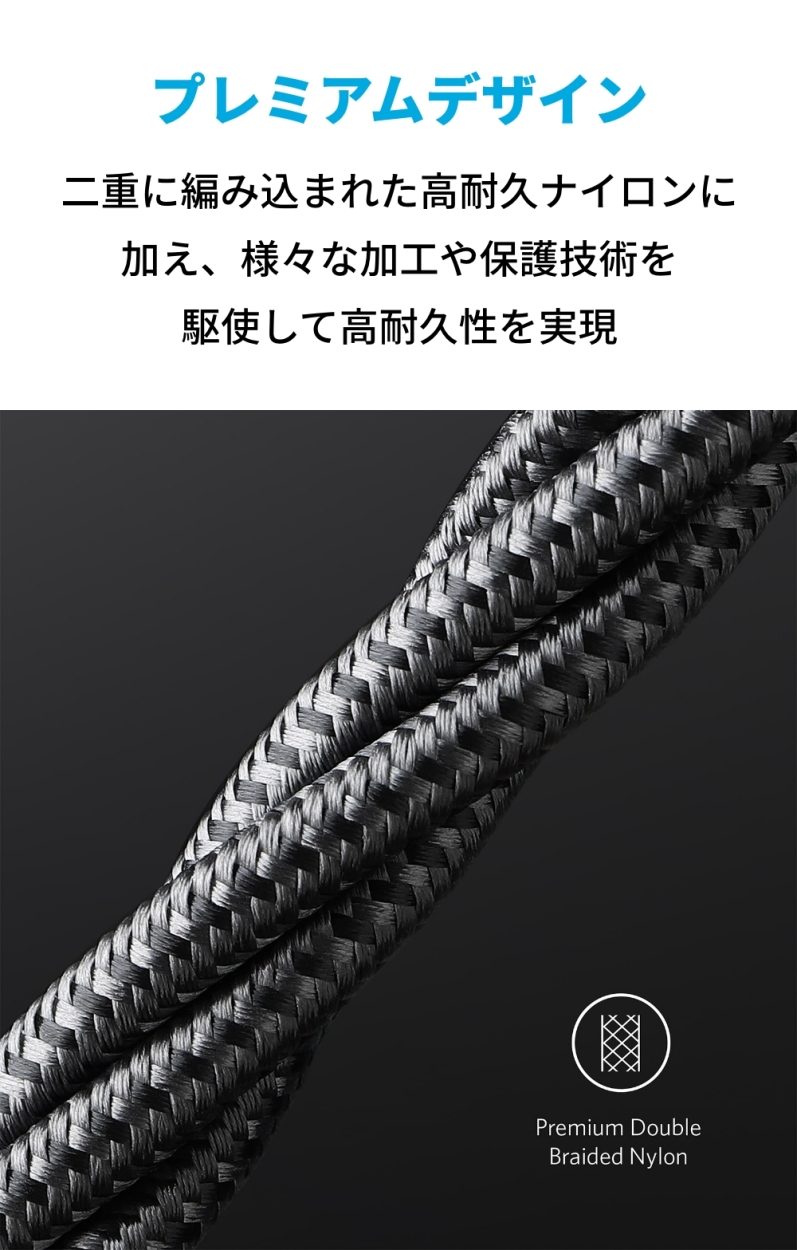 ・優れた耐久性:ケーブルに編み込み式の高耐久ナイロン素材を使用し、12,000回以上の折り曲げにも耐える優れた耐久性を実現しました。