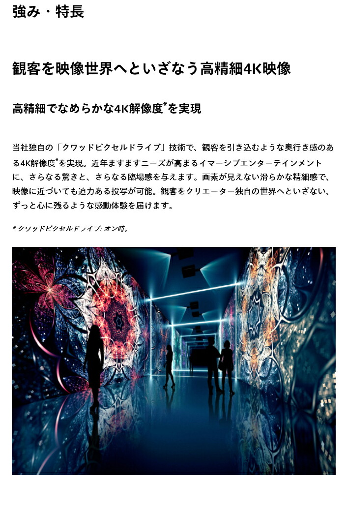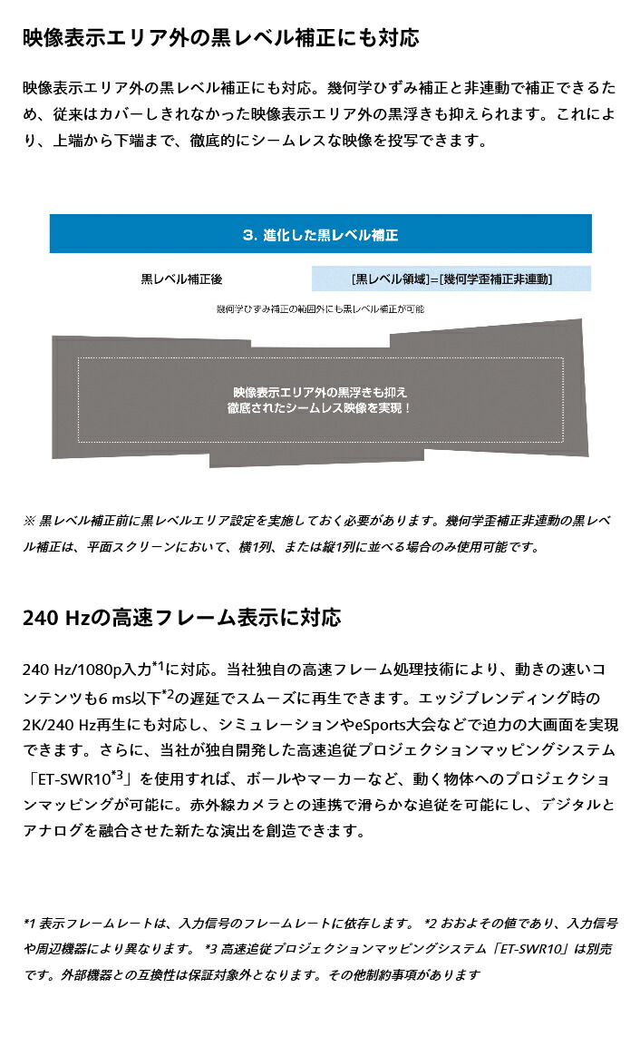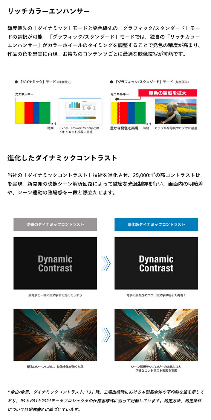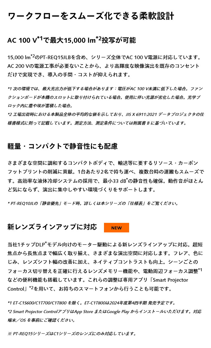1.工場出荷時における本製品全体の平均的な値を示しており、JIS X 6911:2021 データプロジェクタの仕様書様式に則って記載しています。測定方法、測定条件については附属書 B に基づいています。