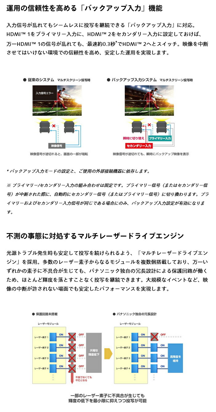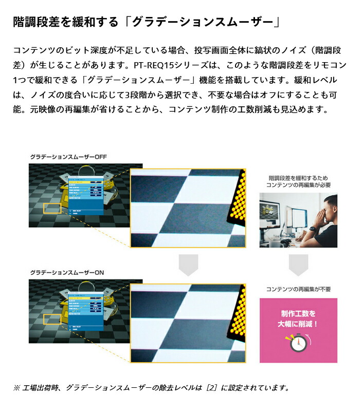 4.[ダイナミックコントラスト]を[4]に設定、IEC62087:2008 ブロードキャストコンテンツ投写、温度35 °C、海抜700 m、ほこり環境0.15 mg/m3 の条件下で、光出力が半減するまでの使用時間です。使用条件や使用環境によって光出力半減時間は異なります。