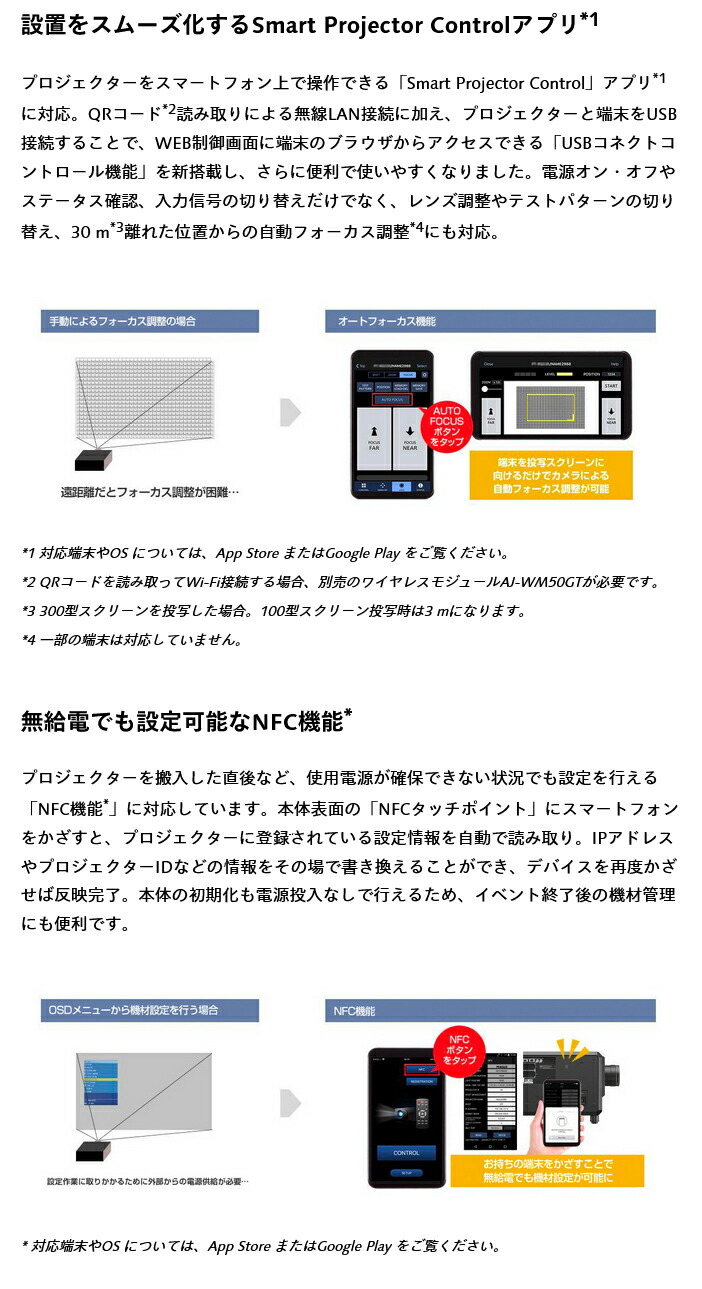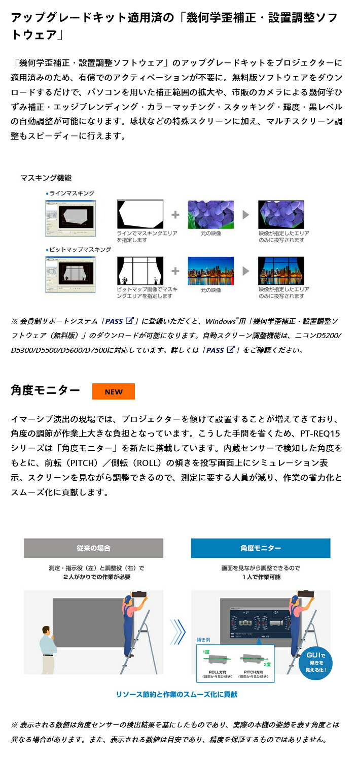 ロゴ転送ソフトウェア [10]、複数台監視制御ソフトウェア、高速追従プロジェクションマッピングシステム、予兆監視ソフトウェア、幾何学歪補正・設置調整ソフトウェア、Smart Projector Control(iOS/AndroidTM版)、プロジェクターネットワーク設定ソフトウェア