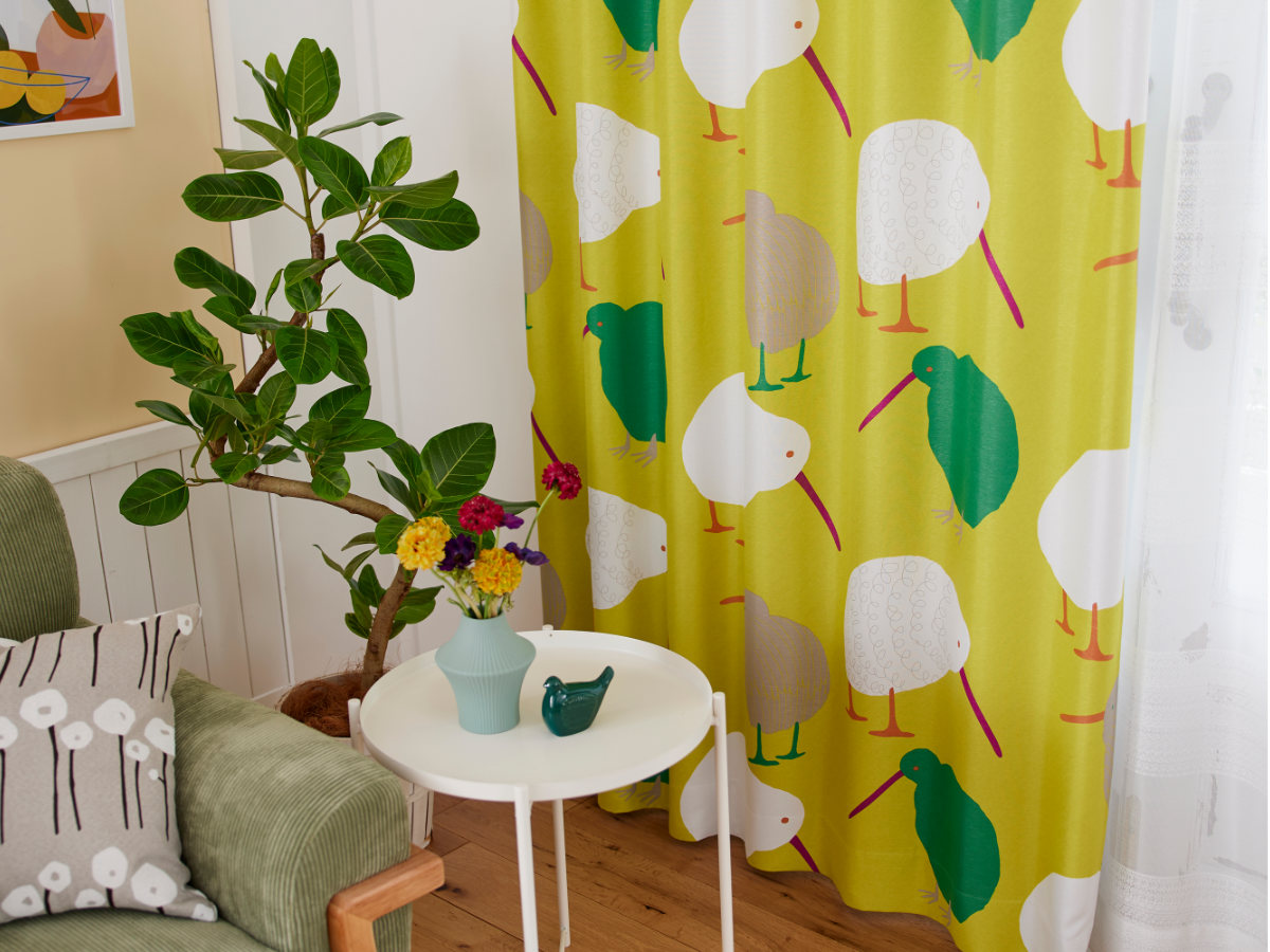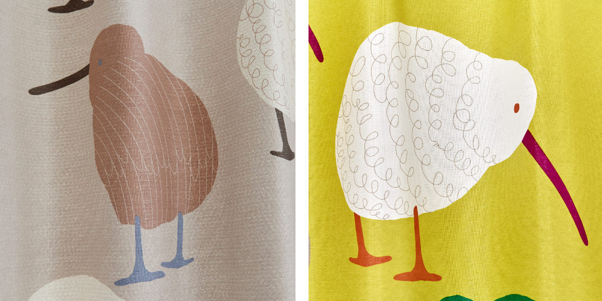 ●丸いフォルムと長いくちばしが可愛いキーウィ柄のドレープカーテンです。