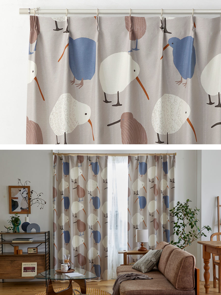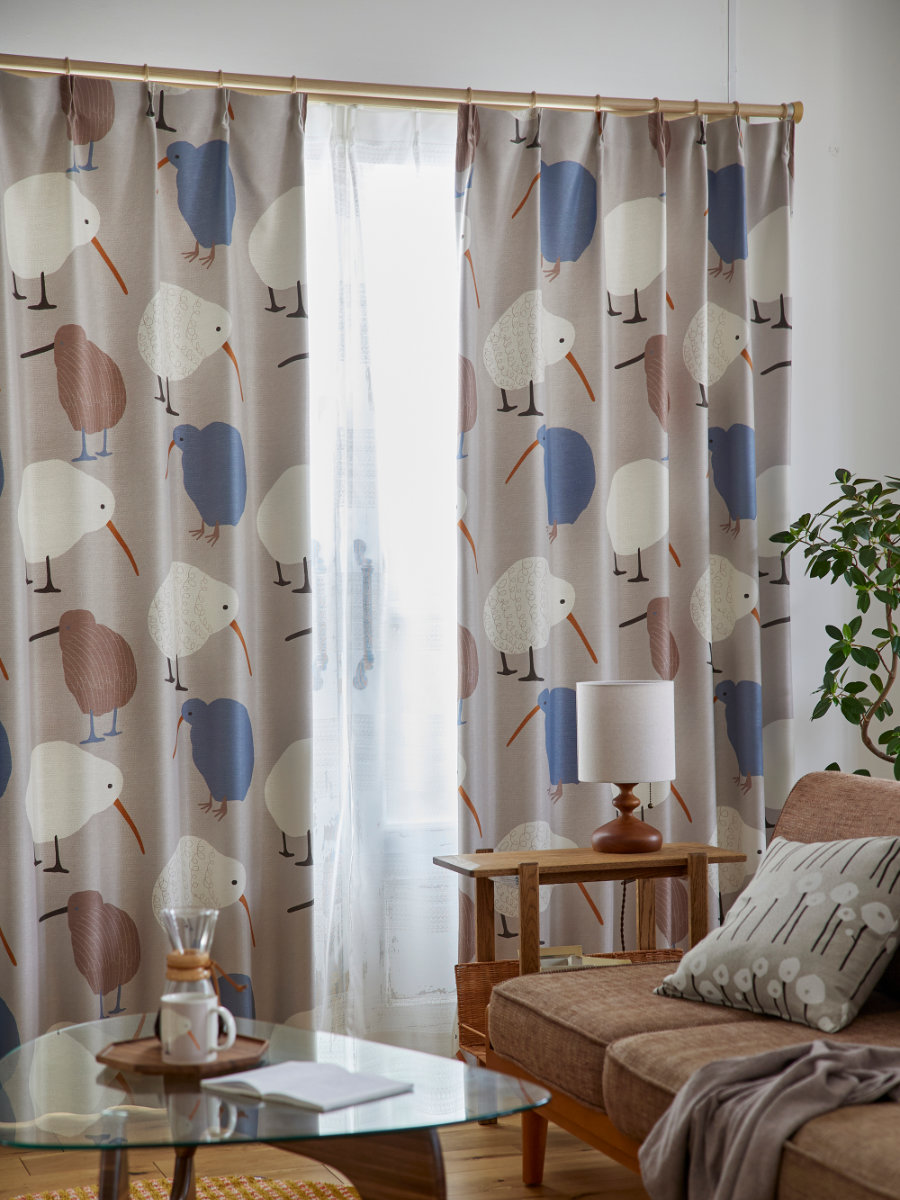 ニュージーランドの国鳥、キーウィ柄です。まん丸なフォルムと長いくちばしがとっても愛らしく、カーテンを閉めた状態でもお部屋の雰囲気を明るくしてくれます。リビングやお子様のお部屋にぴったりのカーテンです。