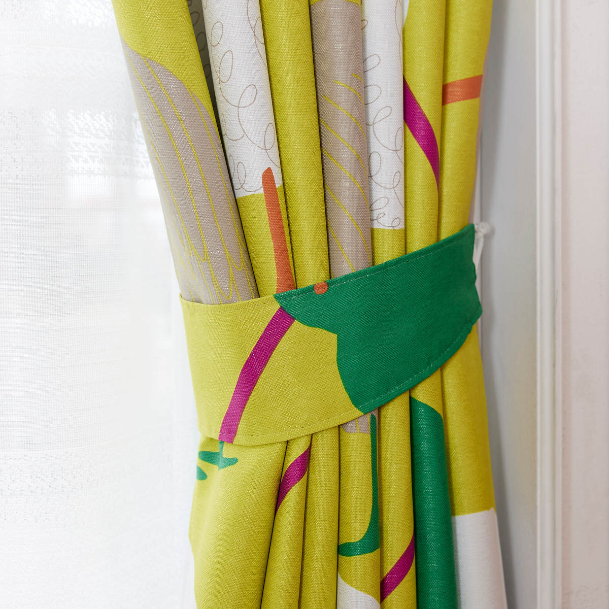 カーテンと同じ生地のタッセル付きです。カーテンを開けておくときもスッキリまとめることができます。