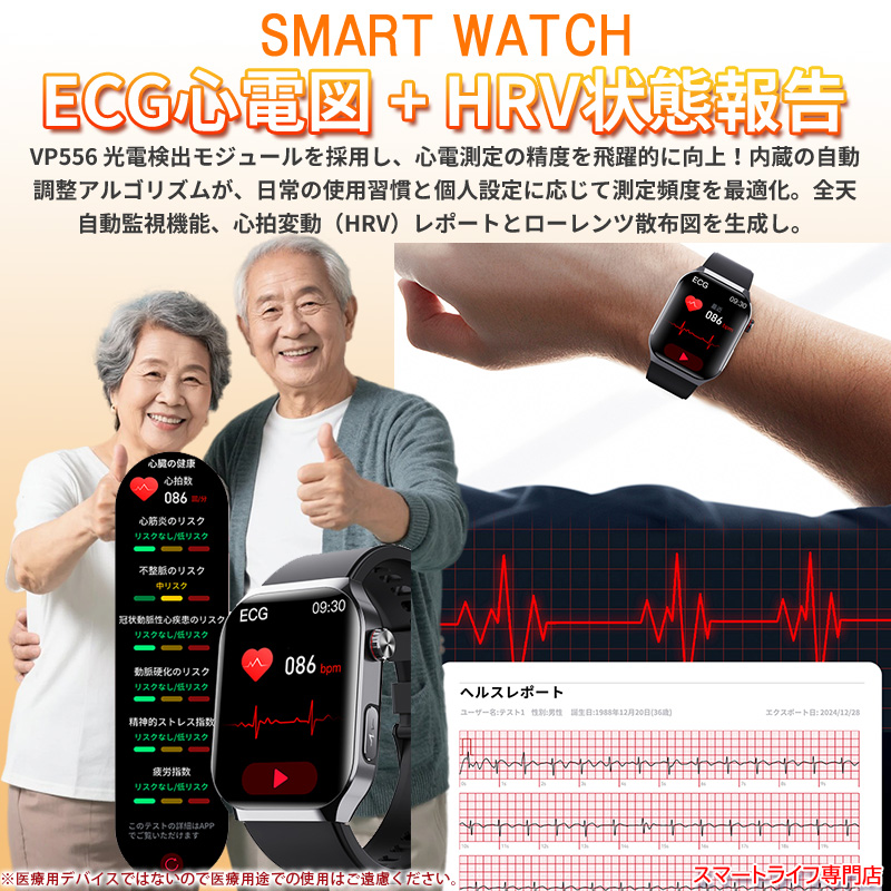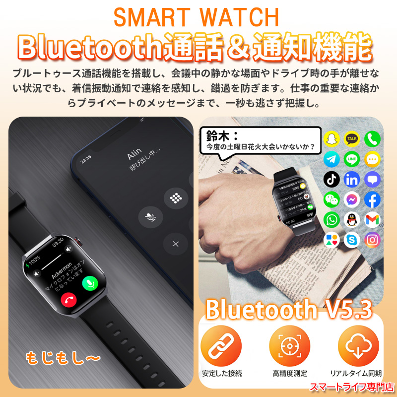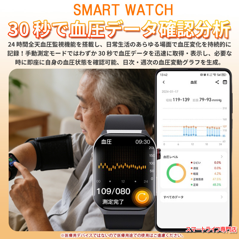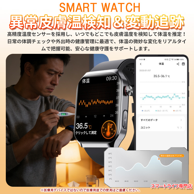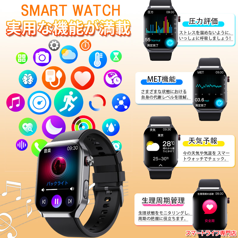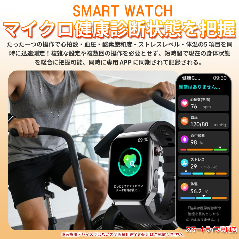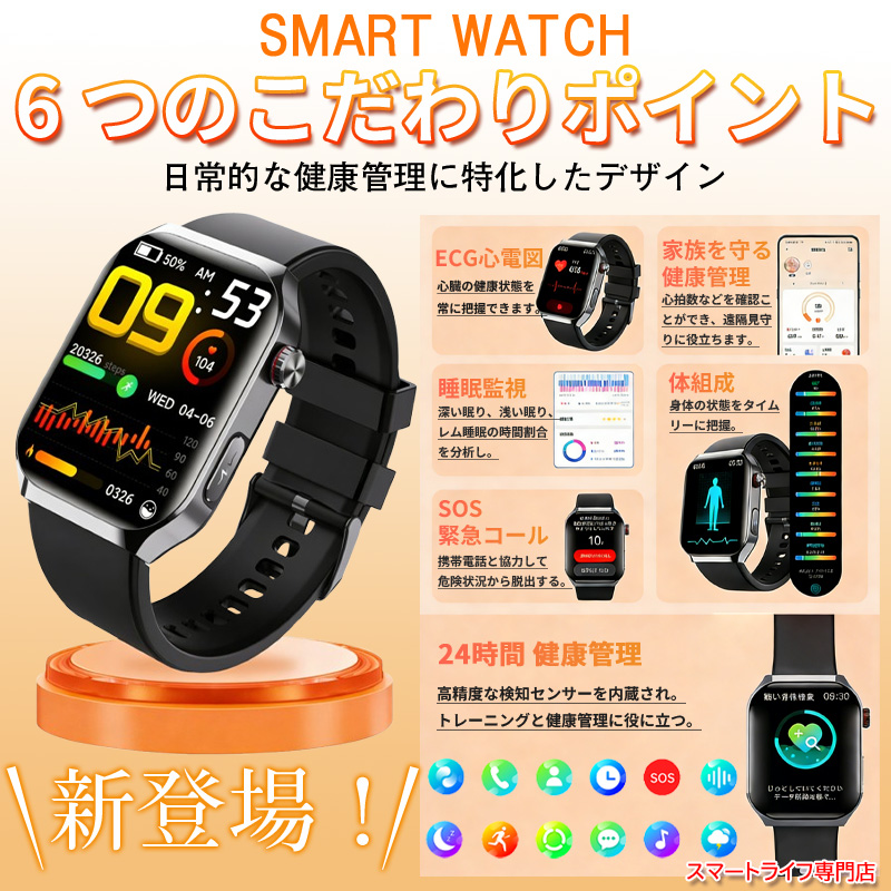 ●24H健康管理:ECG PPG心電図、血液成分、体組成分析、多機能健康測定、血中脂質、尿酸、血圧、血中酸素、通話可能、カロリー、24時間体温監視、アラート、体温、睡眠監視や心拍数などの測定機能付き