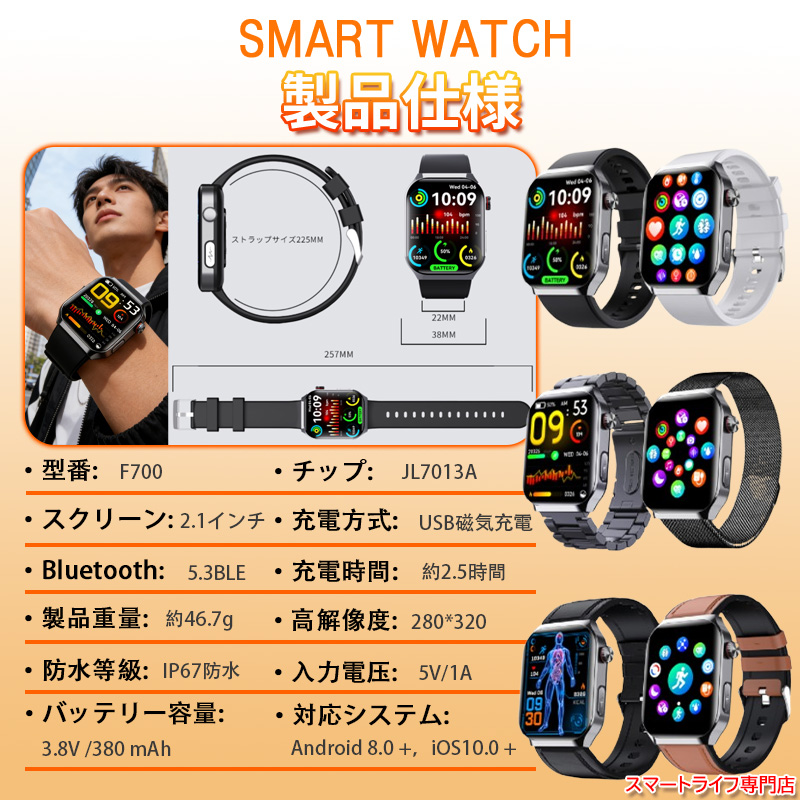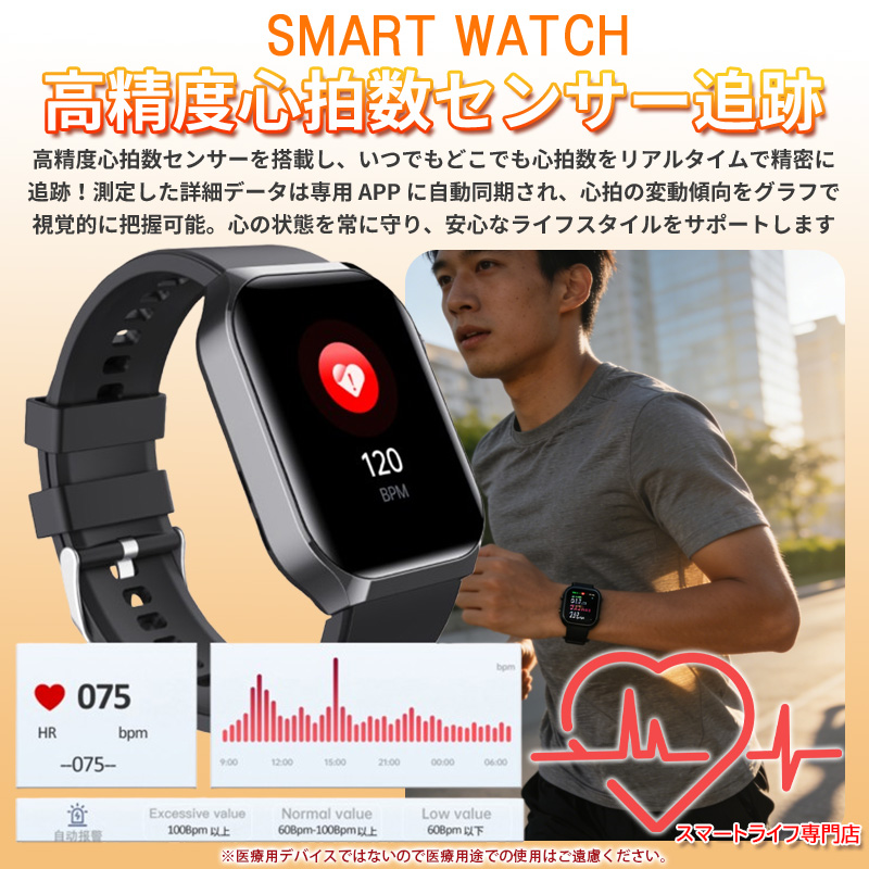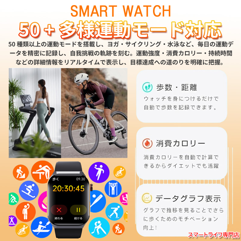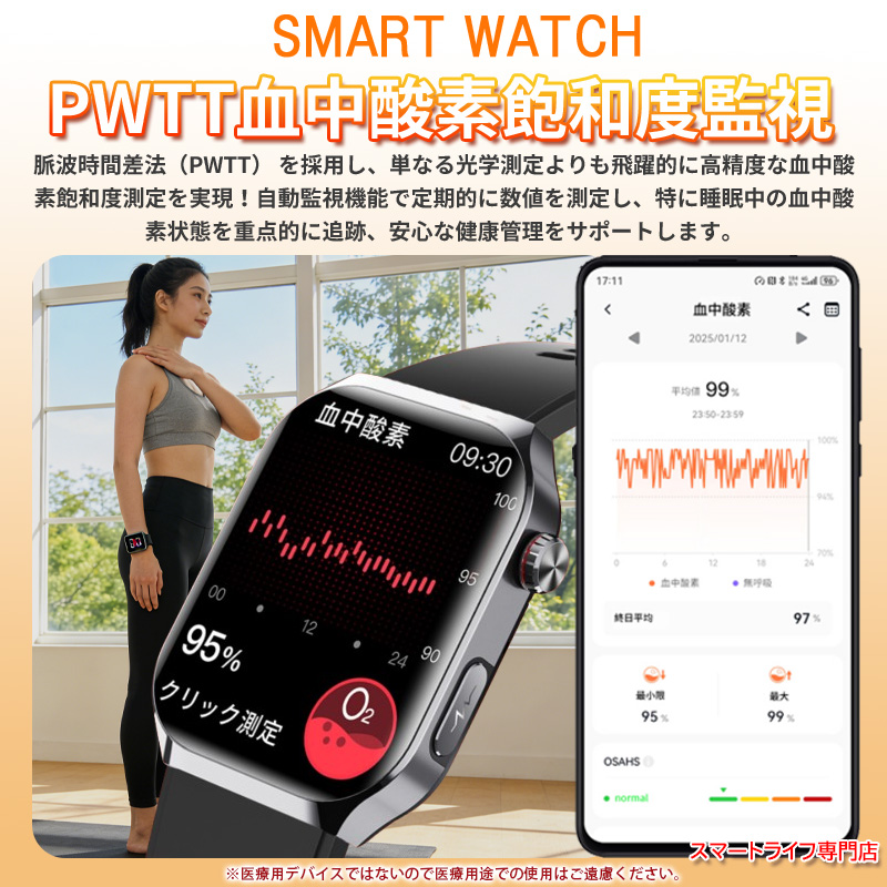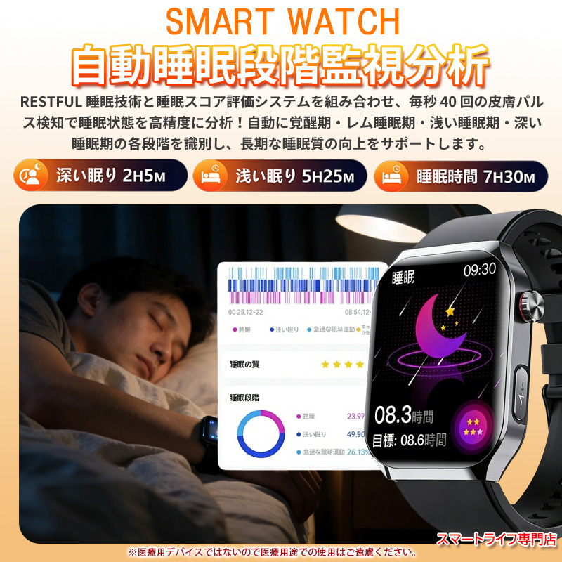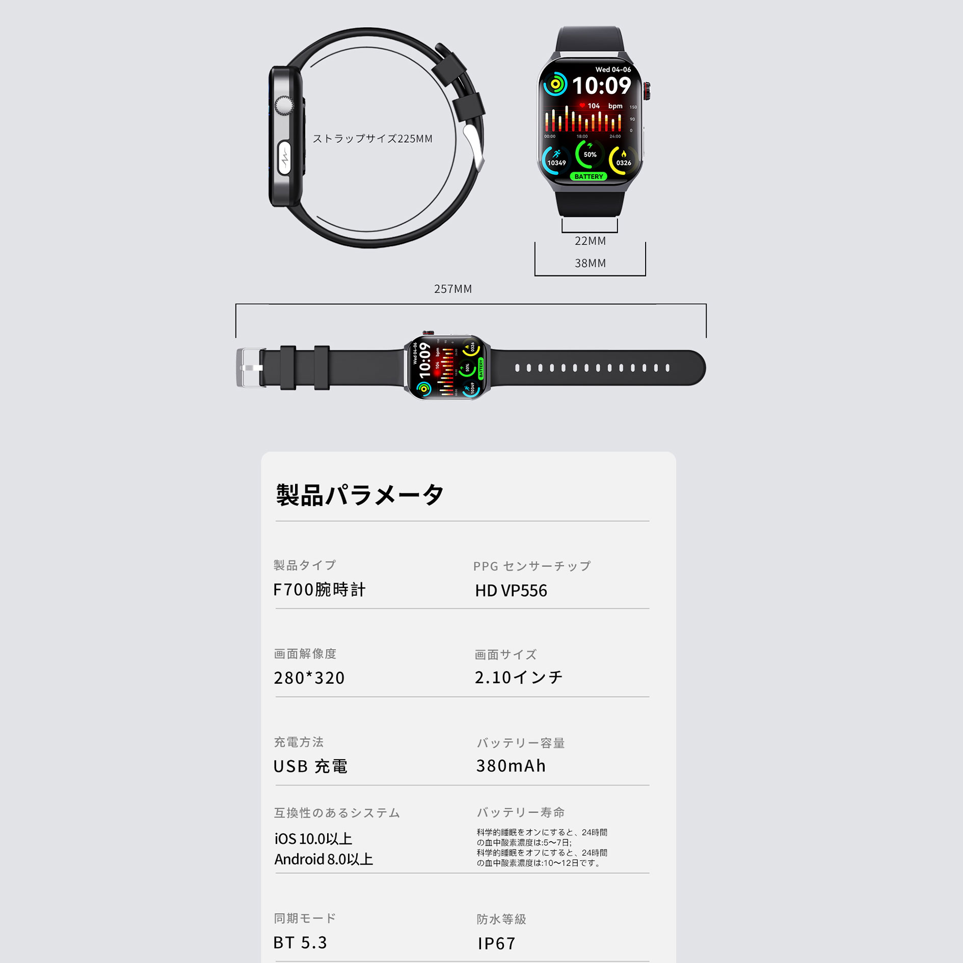 ●24H健康管理:ECG PPG心電図、血液成分、体組成分析、多機能健康測定、血中脂質、尿酸、血圧、血中酸素、通話可能、カロリー、24時間体温監視、アラート、体温、睡眠監視や心拍数などの測定機能付き