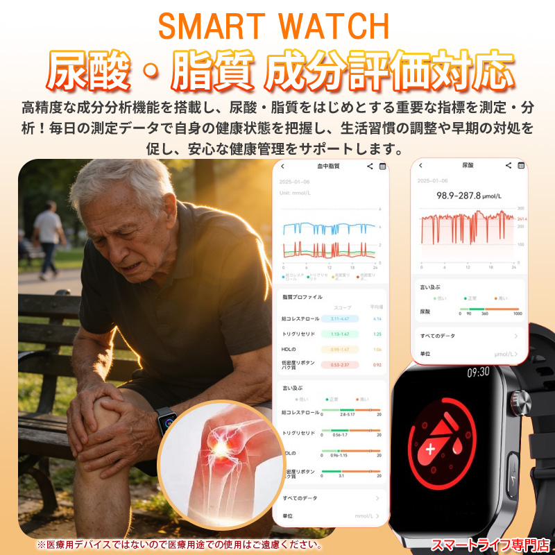 「業界最新モデル」スマートウォッチ 医療レベル 血圧測定 心拍数 心電図 体組成 血液成分分析 血中酸素 尿酸 血中脂質 SOS機能 睡眠 体温 呼吸 音楽再生 歩数計