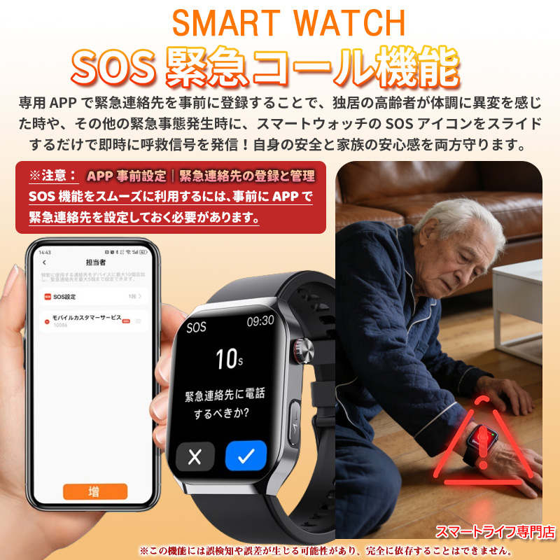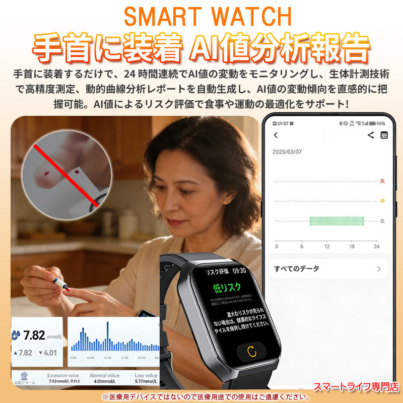 スマートウォッチ 血糖値 血圧測定 心電図 心拍数 睡眠 SOS機能