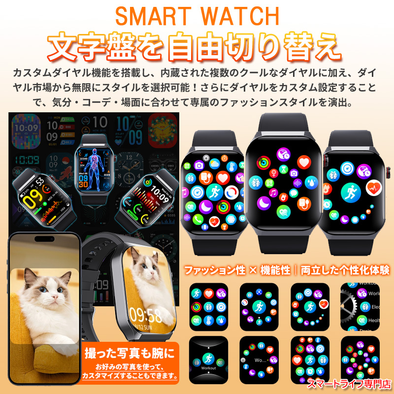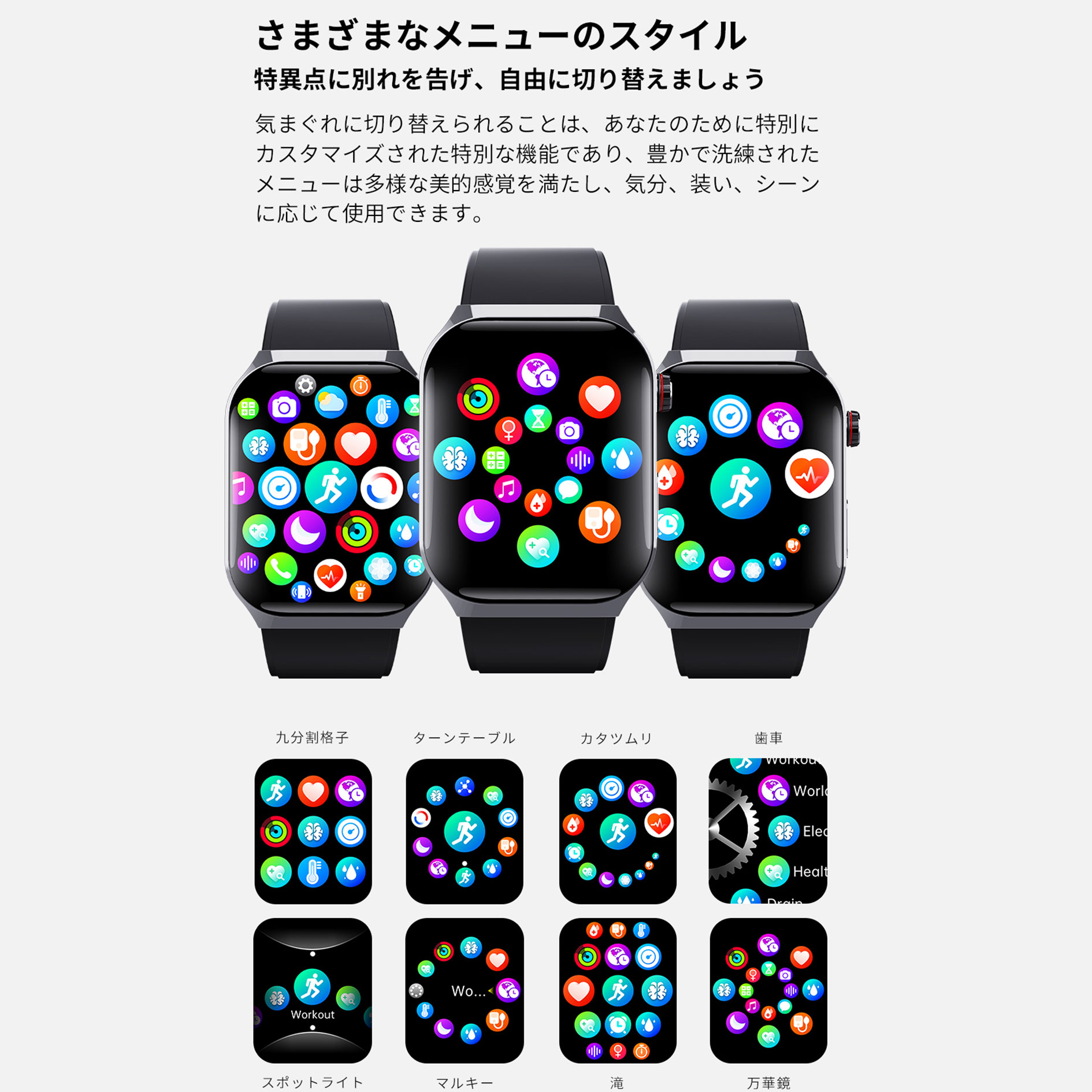 このスマートウォッチは業界初の2.1インチ大画面のタッチパネルを採用し、老眼の方にも見やすい!画質がより鮮明になり、高精度な大画面で通知や文字が一目瞭然に表示される。上下左右のスライド操作で機能の切替も簡単です。本体で6つの表盤画面搭載する以外、専用アプリで100+種類の文字盤を自由に設定することができます。他に、家族、恋人、アイドル、及びペット等の好きな写真も文字盤に設定可能で毎日新鮮さを味わえる。