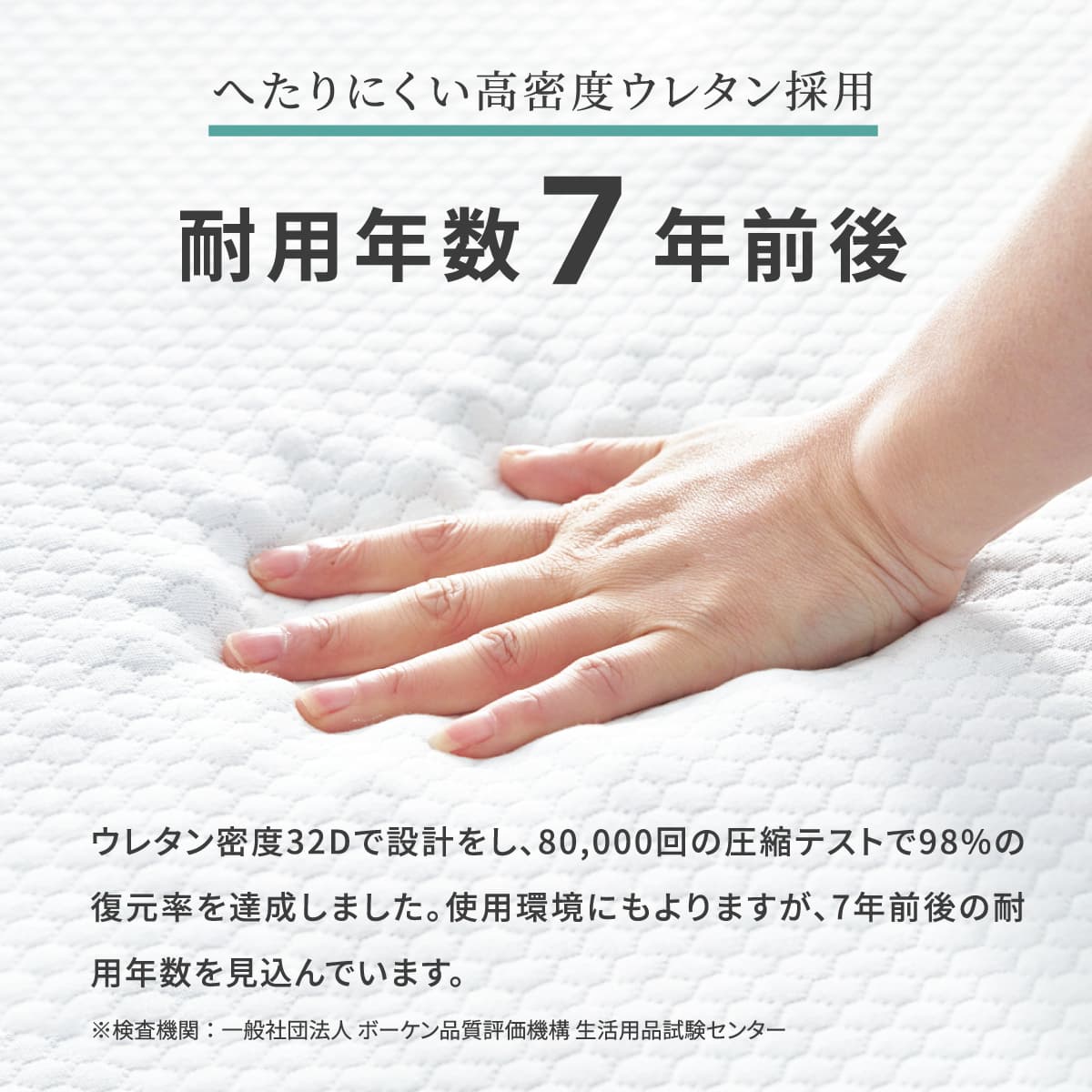 本体:ウレタンフォーム、1枚もの波形:かため(150ニュートン)、復元率99%:(外装生地:ポリエステル100%)