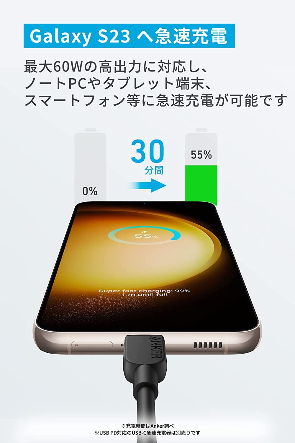 最大60Wの高出力に対応し、ノートPCやタブレット端末、スマートフォン等の幅広いUSB-C機器に急速充電が可能です。USB PD対応の充電器と共に使用することでSamsung Galaxy S23にわずか30分で55%まで充電することが可能です。(※USB-C急速充電器は別売です)